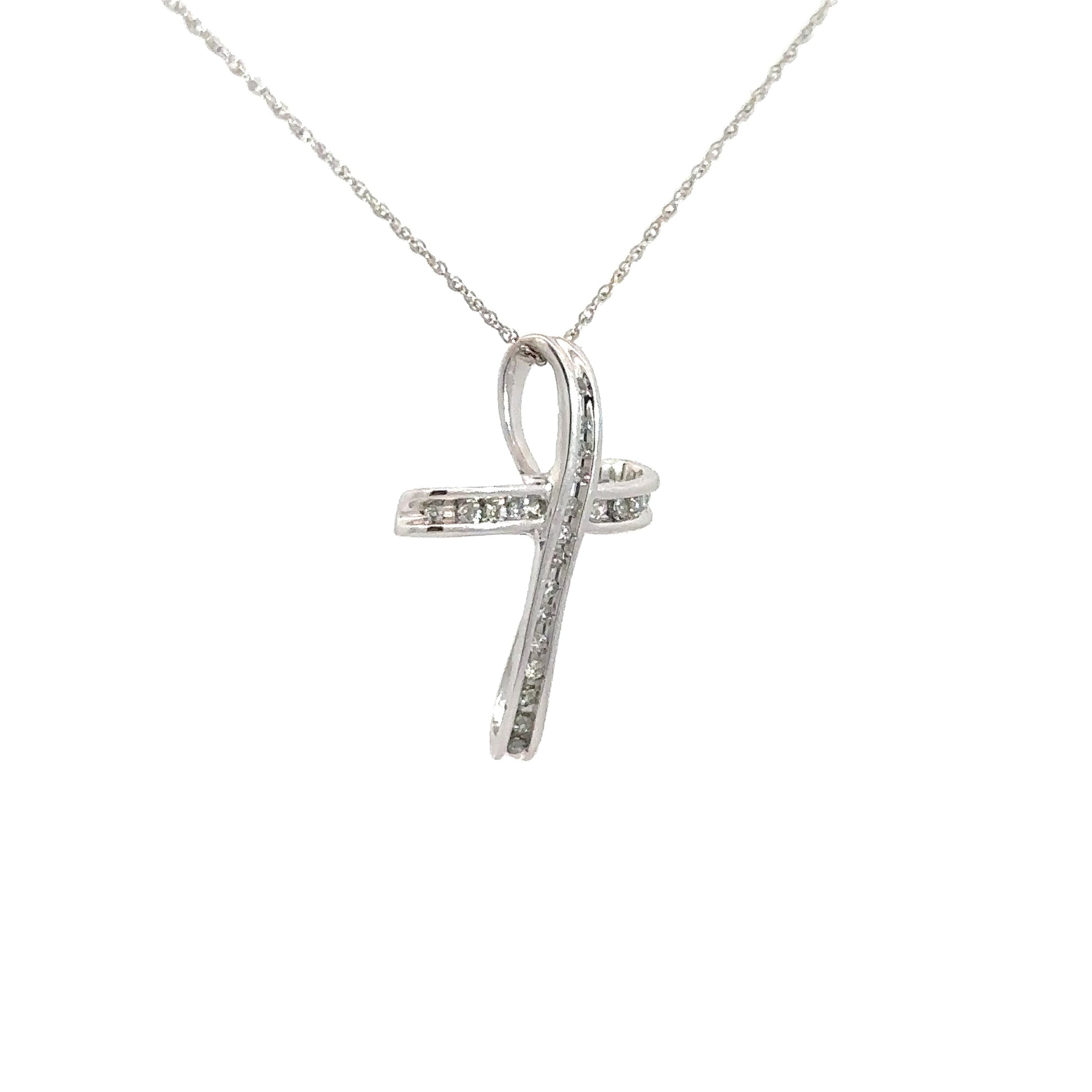 Elevate your faith with this stunning 10k white gold cross, where timeless elegance meets spiritual significance. Featuring sparkling round brilliant diamonds expertly channel-set throughout, this piece radiates sophistication with approximately .10 carats of total diamond weight. Perfect for daily wear or special occasions, this refined cross pendant combines the durability of white gold with the brilliance of genuine diamonds, creating a meaningful accessory that celebrates your beliefs in style.