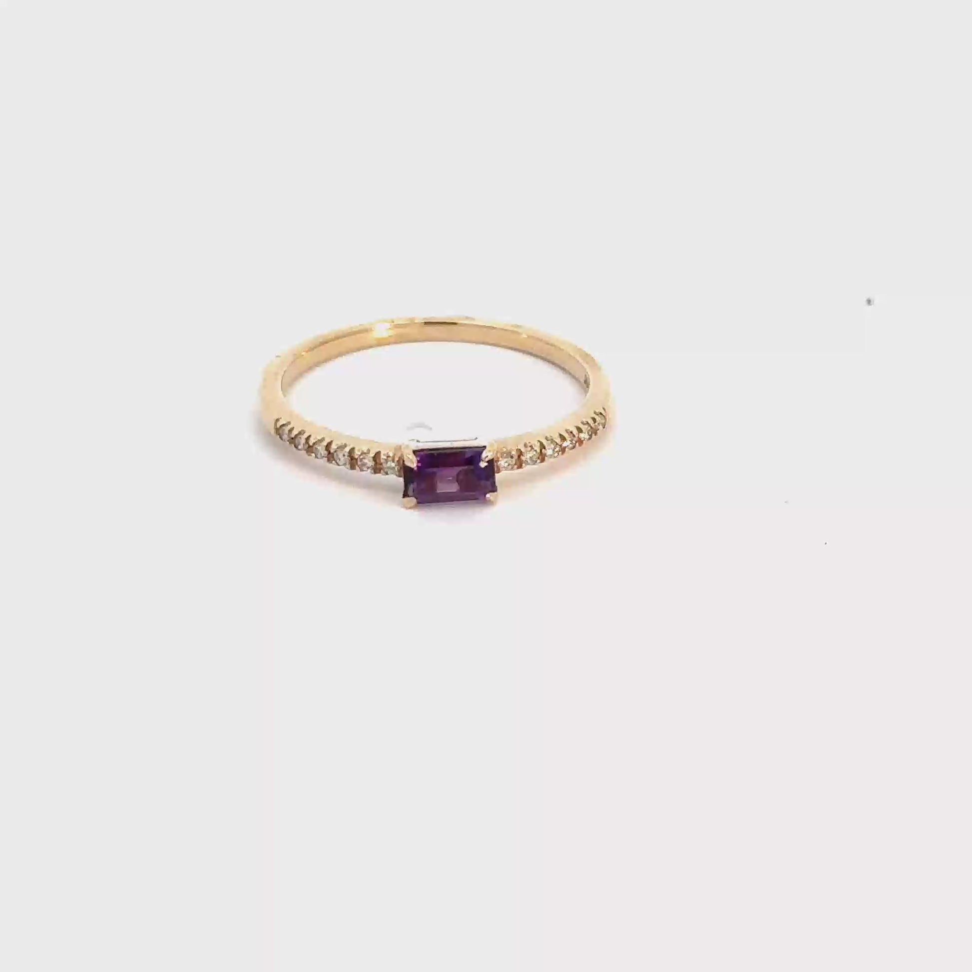 This ring contains a stunning emerald-cut amethyst and 12 round brilliant diamonds, 6 on each side of the center, all set in 10k yellow gold.