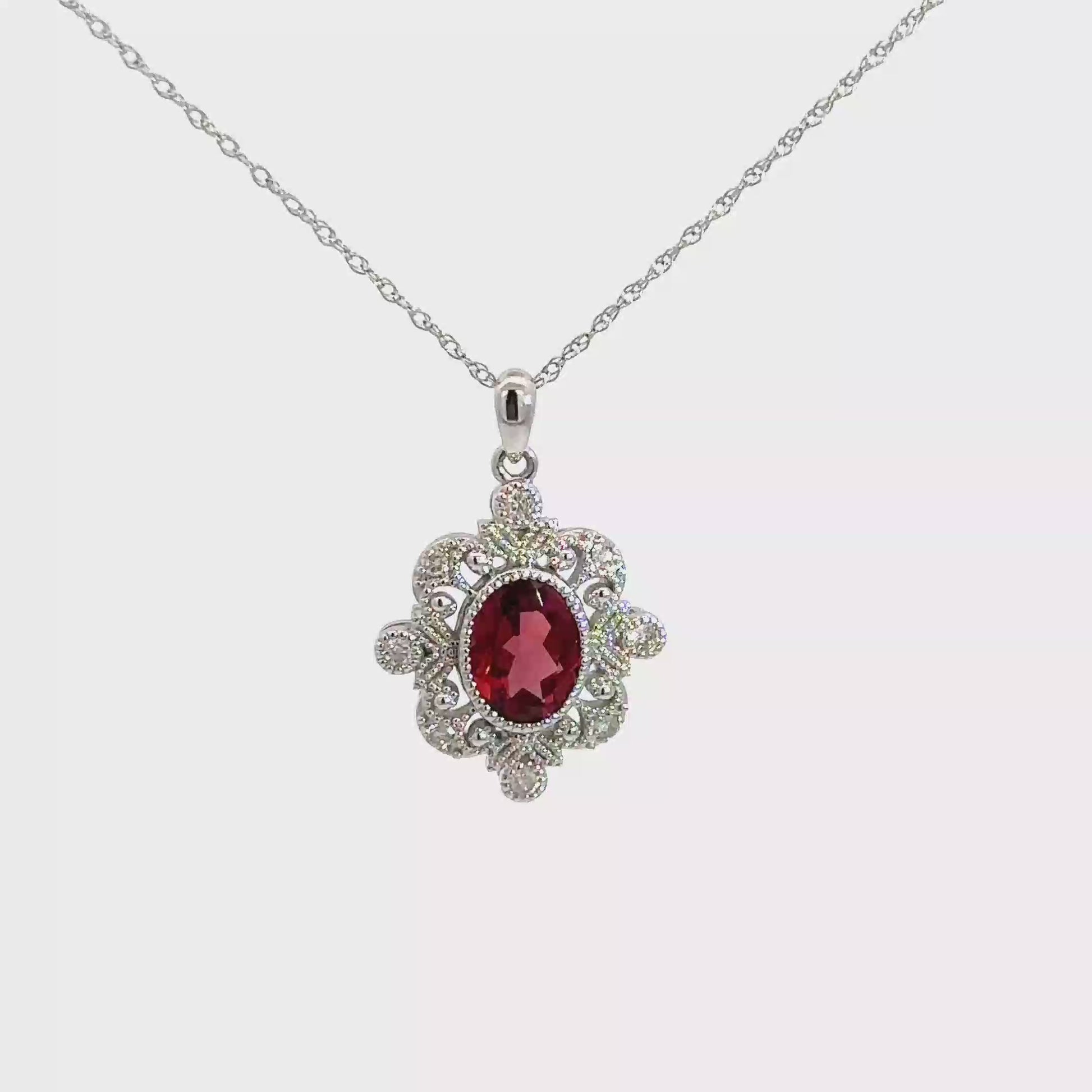 This 14k white gold garnet and diamond pendant features an oval .49ct garnet and 8 round brilliant diamonds with a total weight of .13cttw, set in a distinctive white gold design.