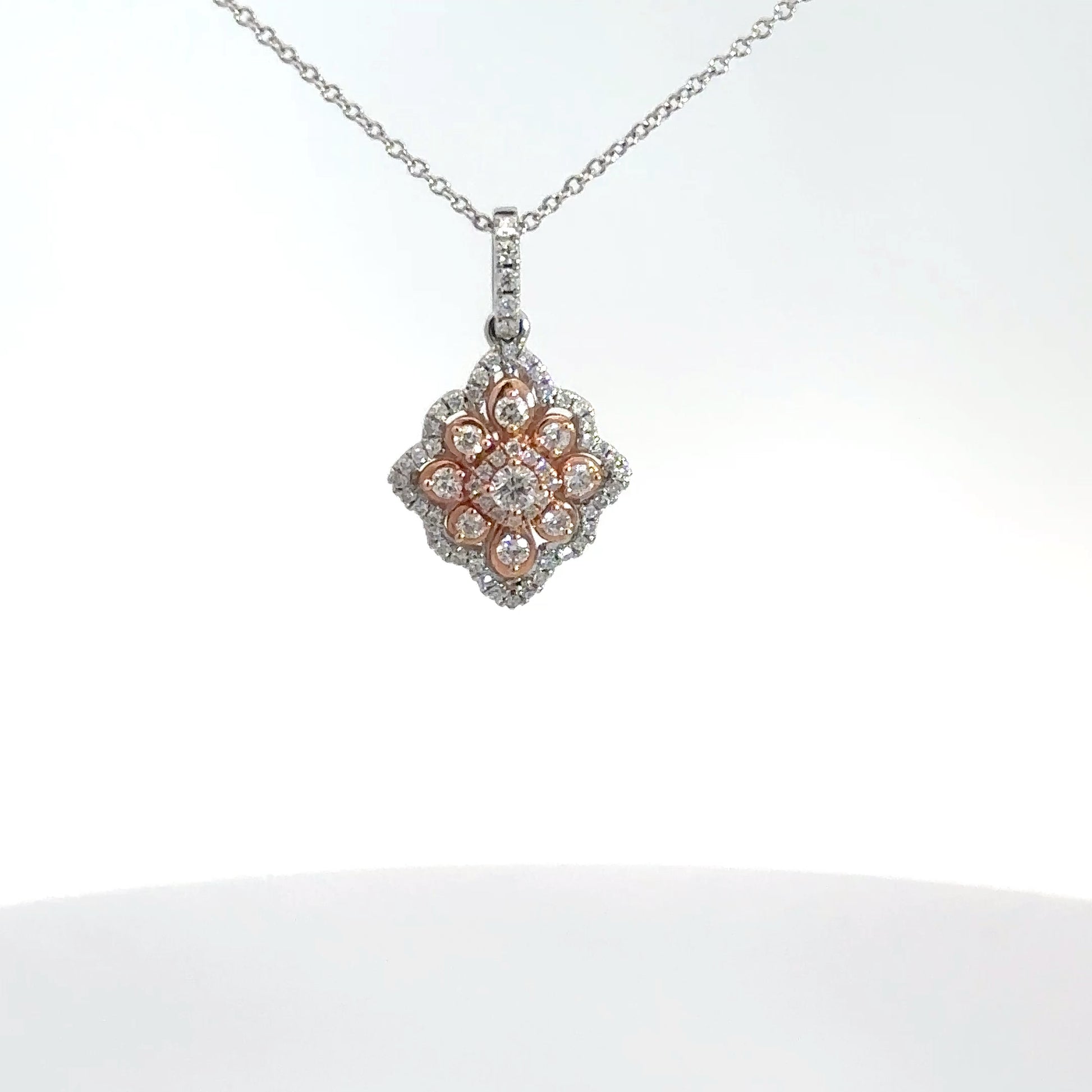 Crafted from 14k white and rose gold, this exquisite diamond pendant boasts a one-of-a-kind fashion design. Accented with 66 round brilliant diamonds, with a total weight of approximately .38cttw, this pendant showcases a clarity of SI2 and a body color of (G-H). Expertly crafted and beautifully designed, this pendant is a true testament to the artistry of fine jewelry.