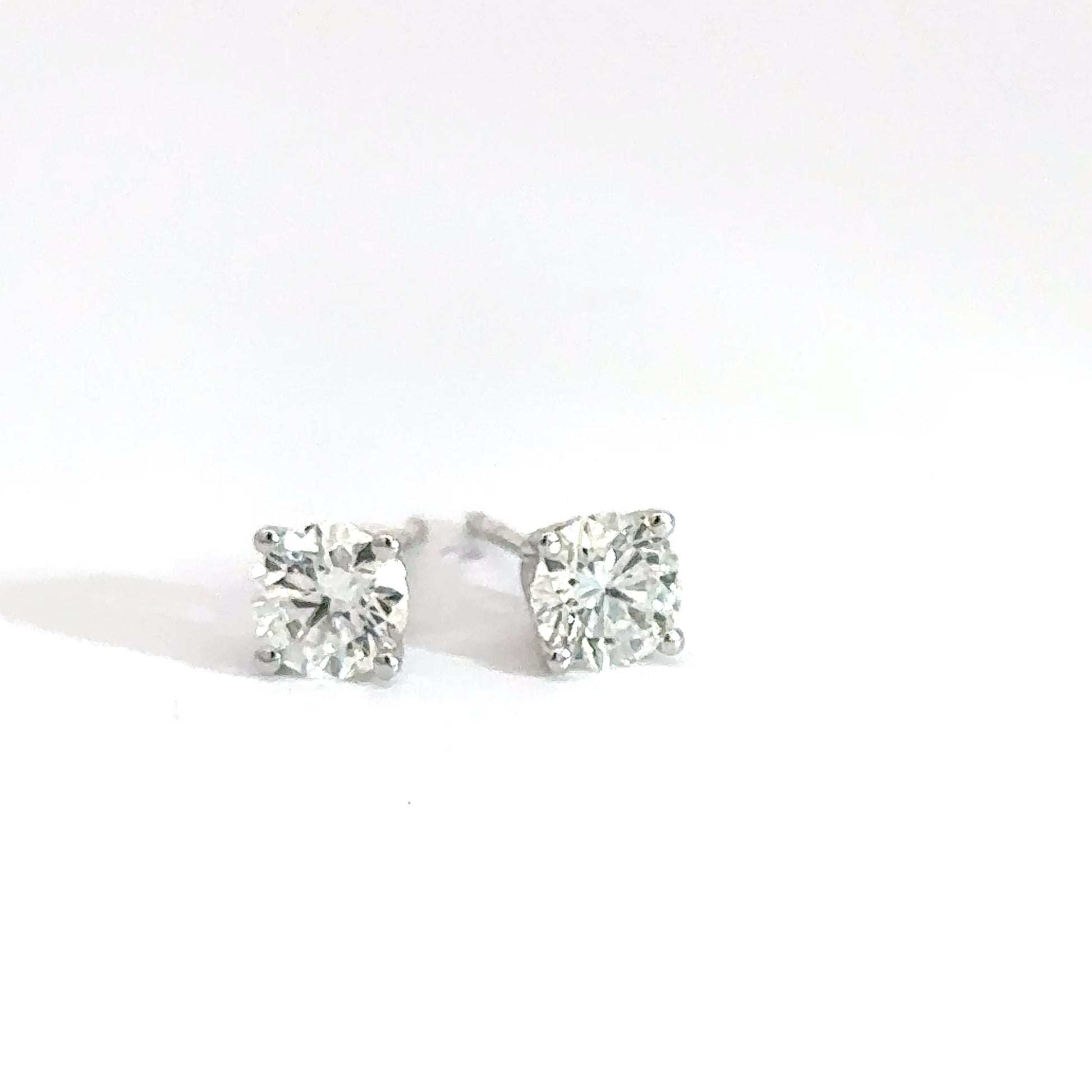 These diamond solitaire earrings are crafted with 14k white gold and feature round brilliant diamonds totaling approximately 1.01cttw. With a clarity range of SI1 and a body color of (G-H).