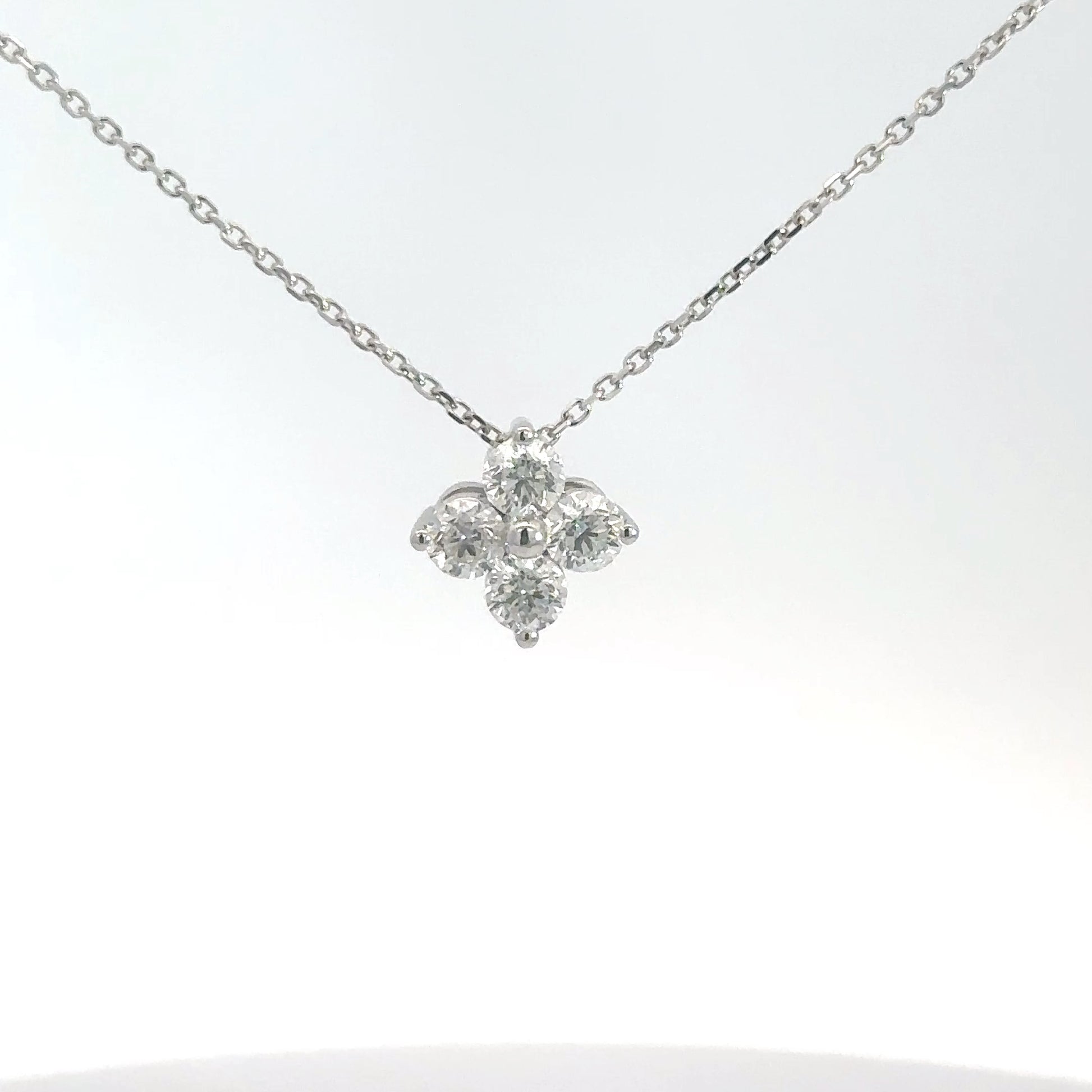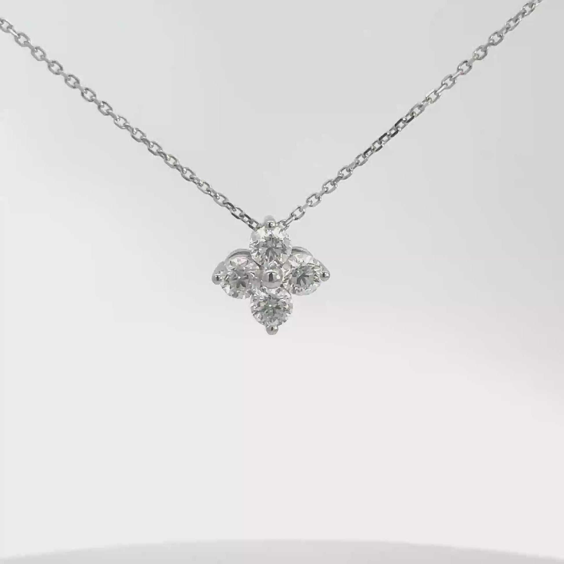 This 14k white gold pendant features a square arrangement of 4 round brilliant diamonds, with a total approximate weight of 1.66cttw. The diamonds have a clarity of SI1 and a body color within the range of G-H.