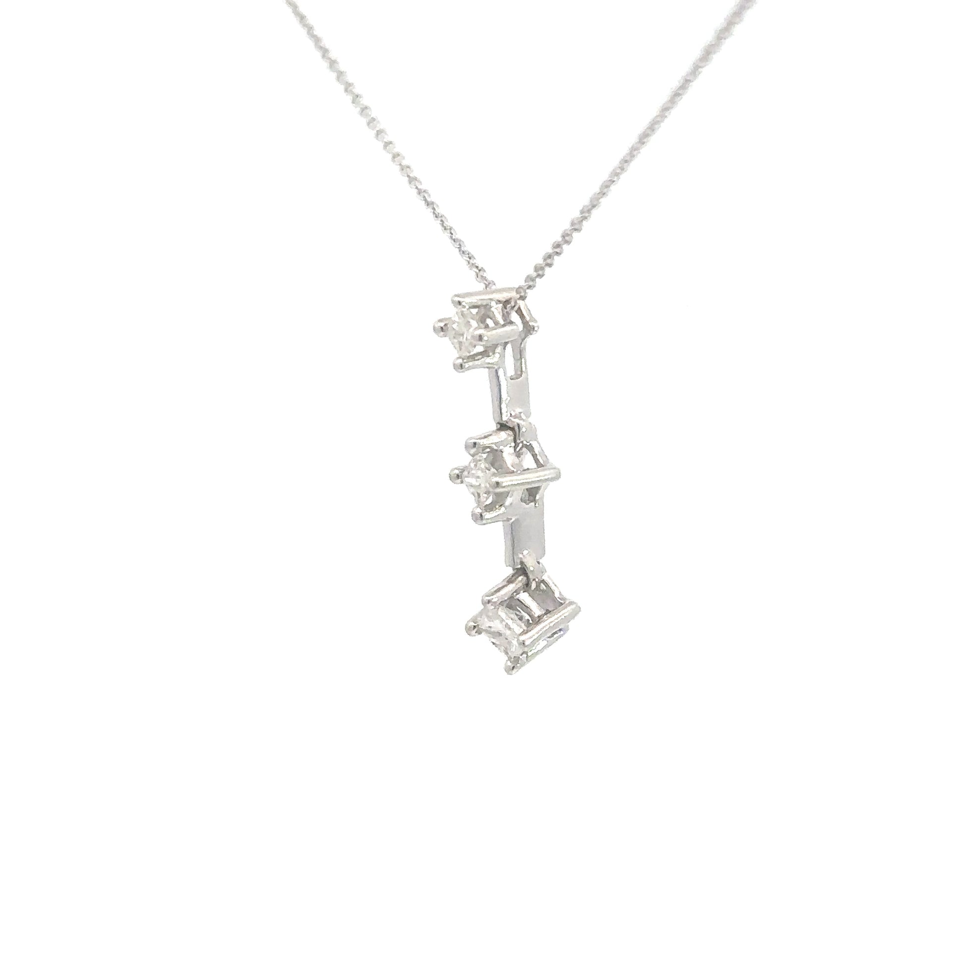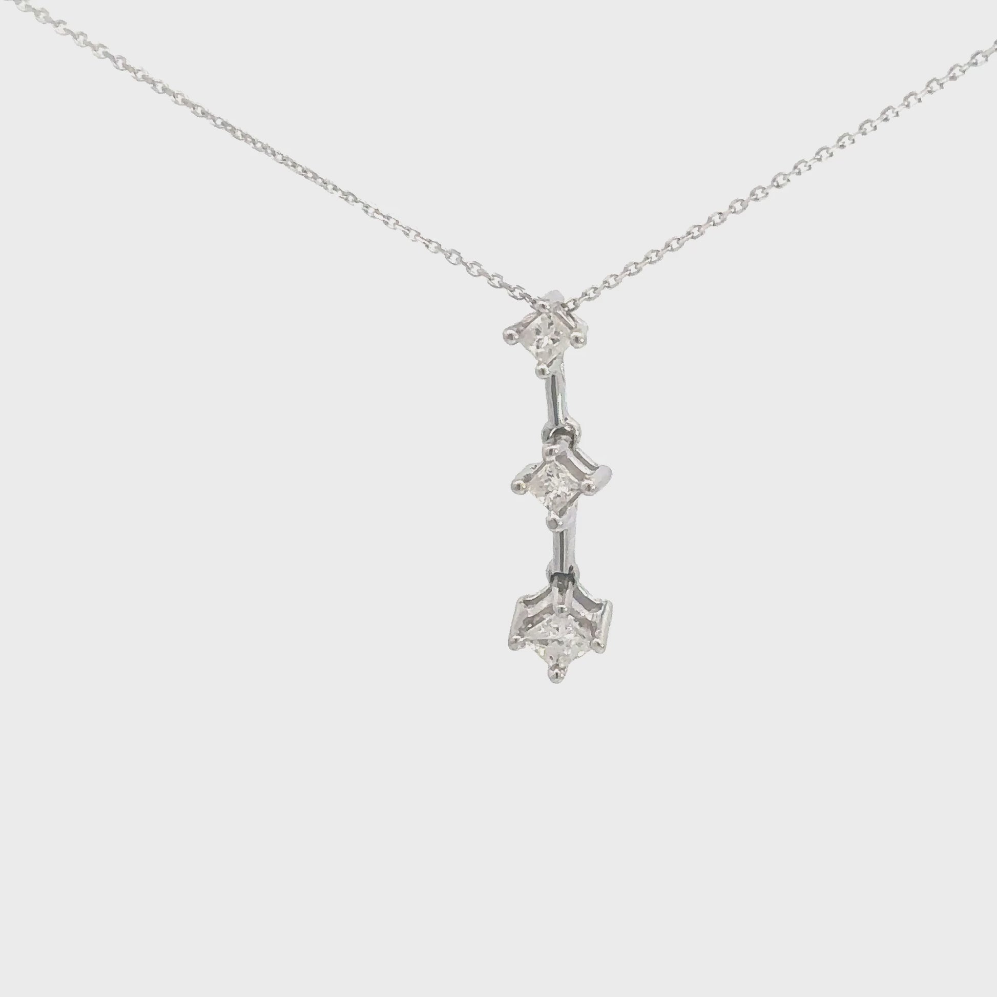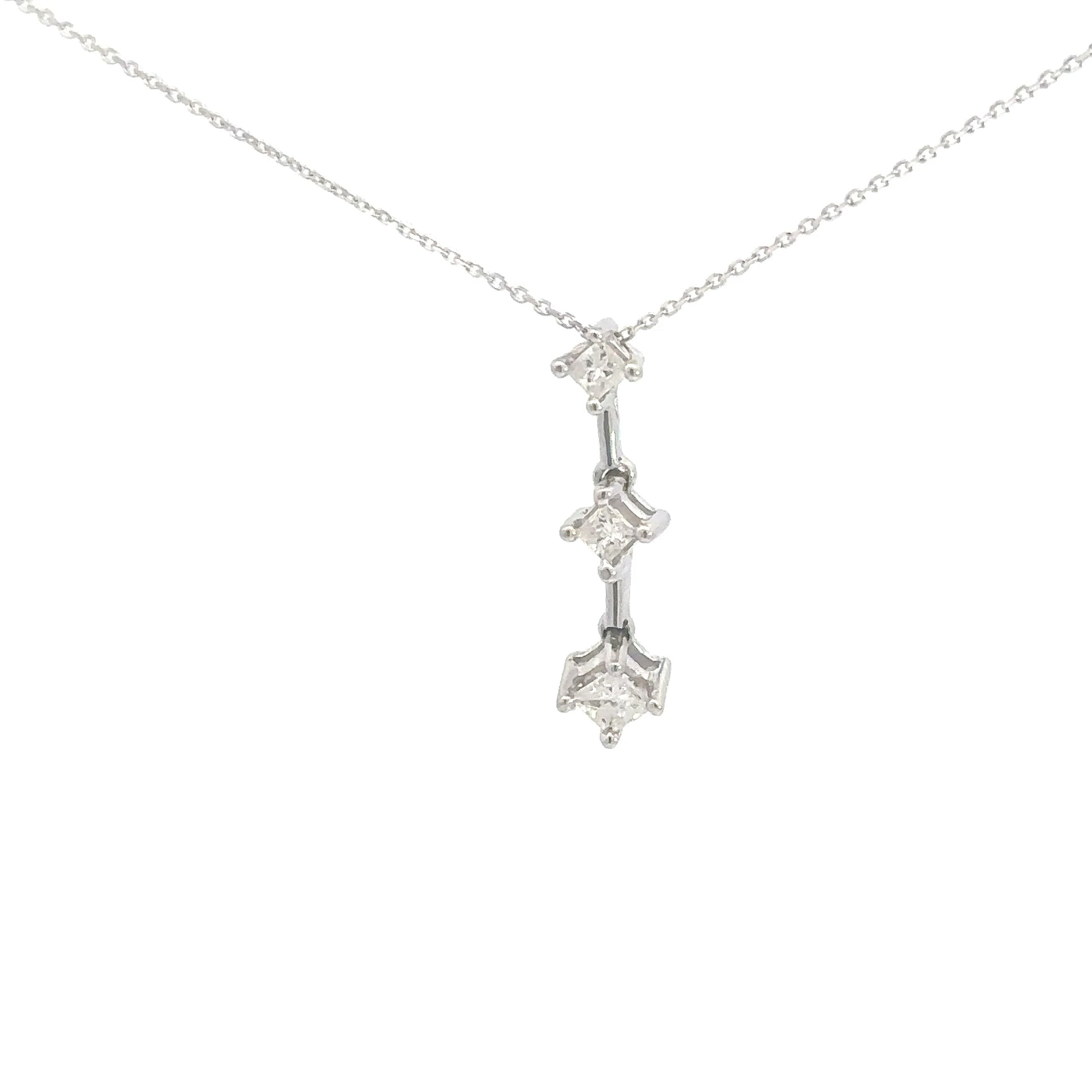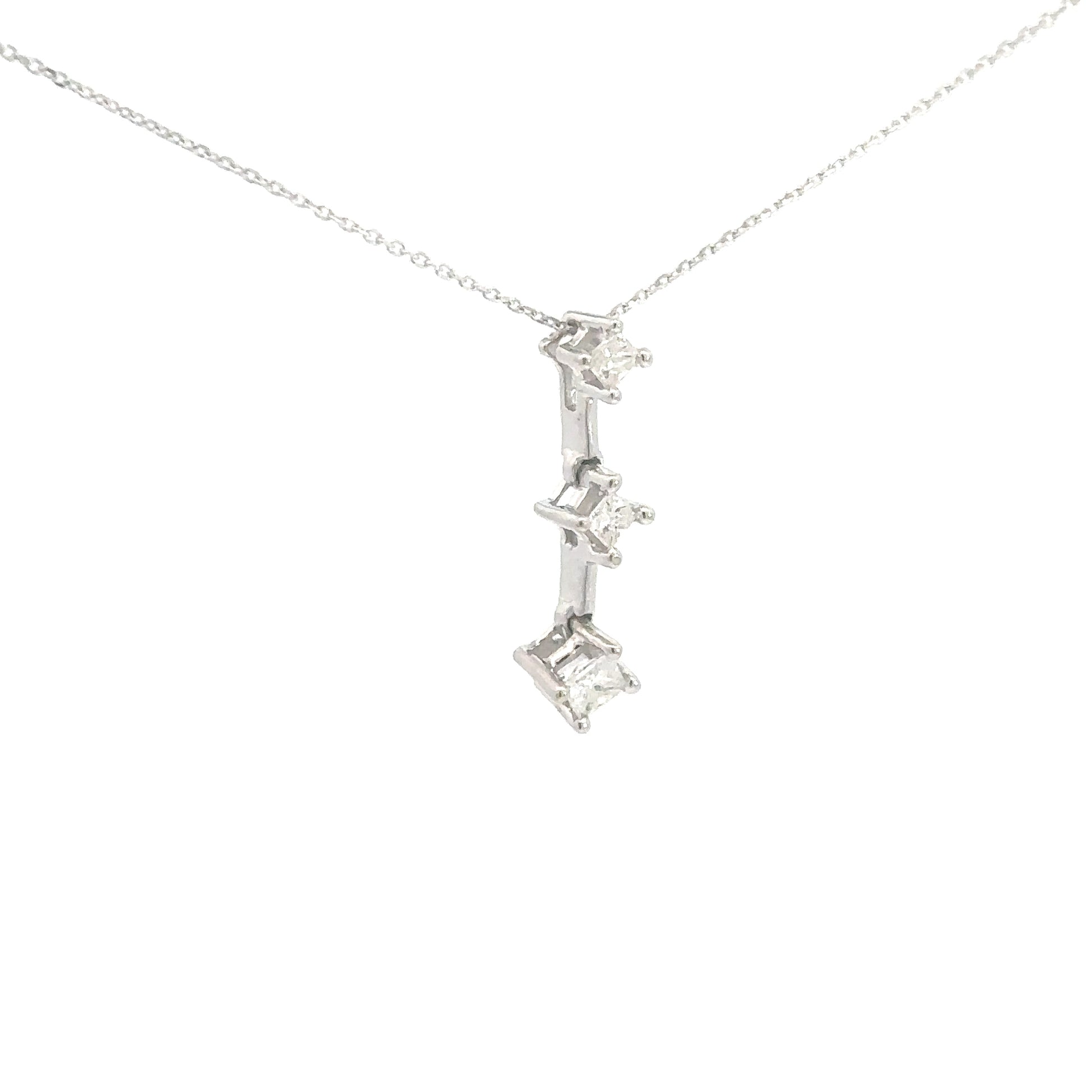 This elegant 14k white gold pendant features a graceful arrangement of three princess cut diamonds, increasing in size from smallest to largest. Together, they total approximately 0.25 carats, showcasing I1 clarity and a near-colorless H-I body tone. Perfect for adding a touch of refined sparkle to any outfit.