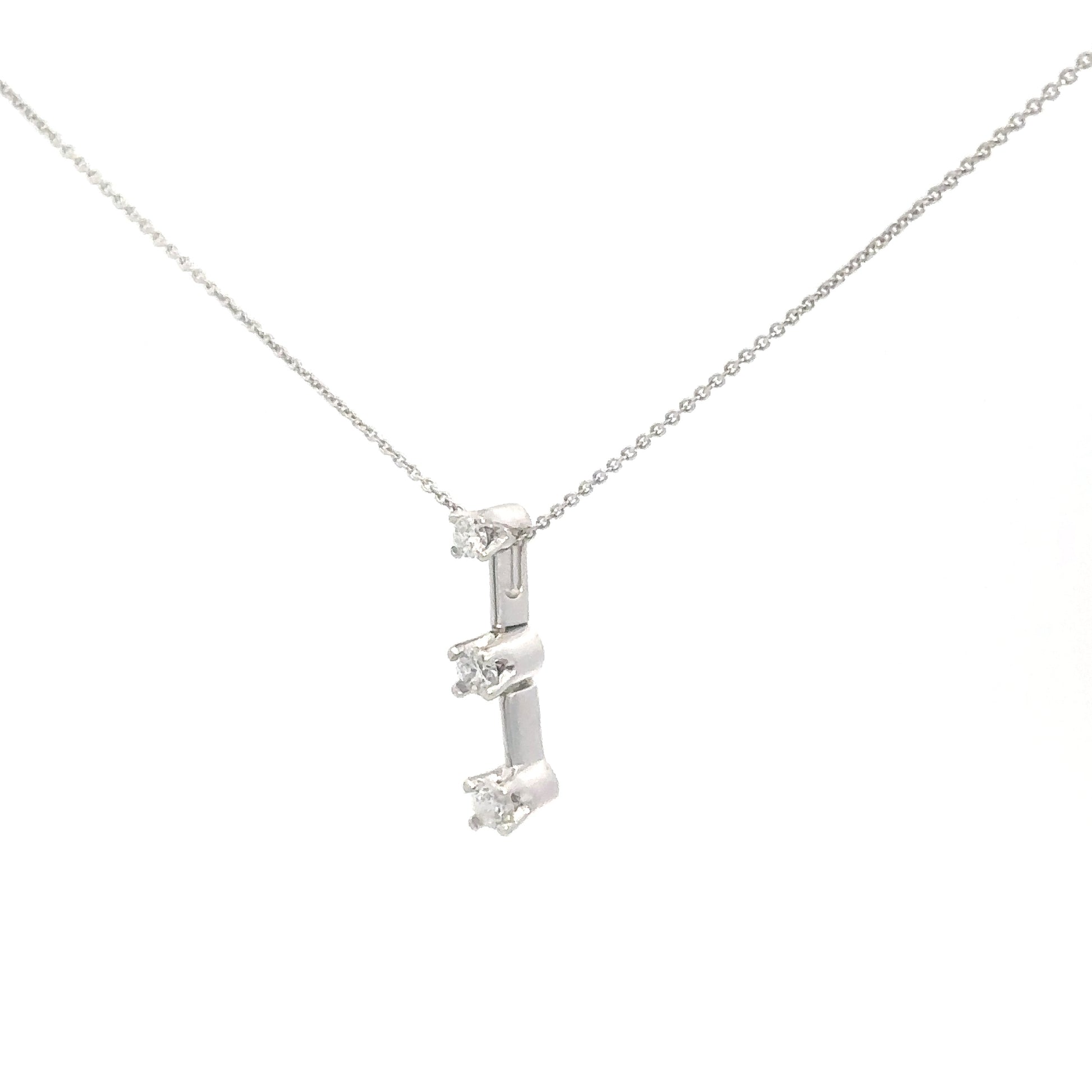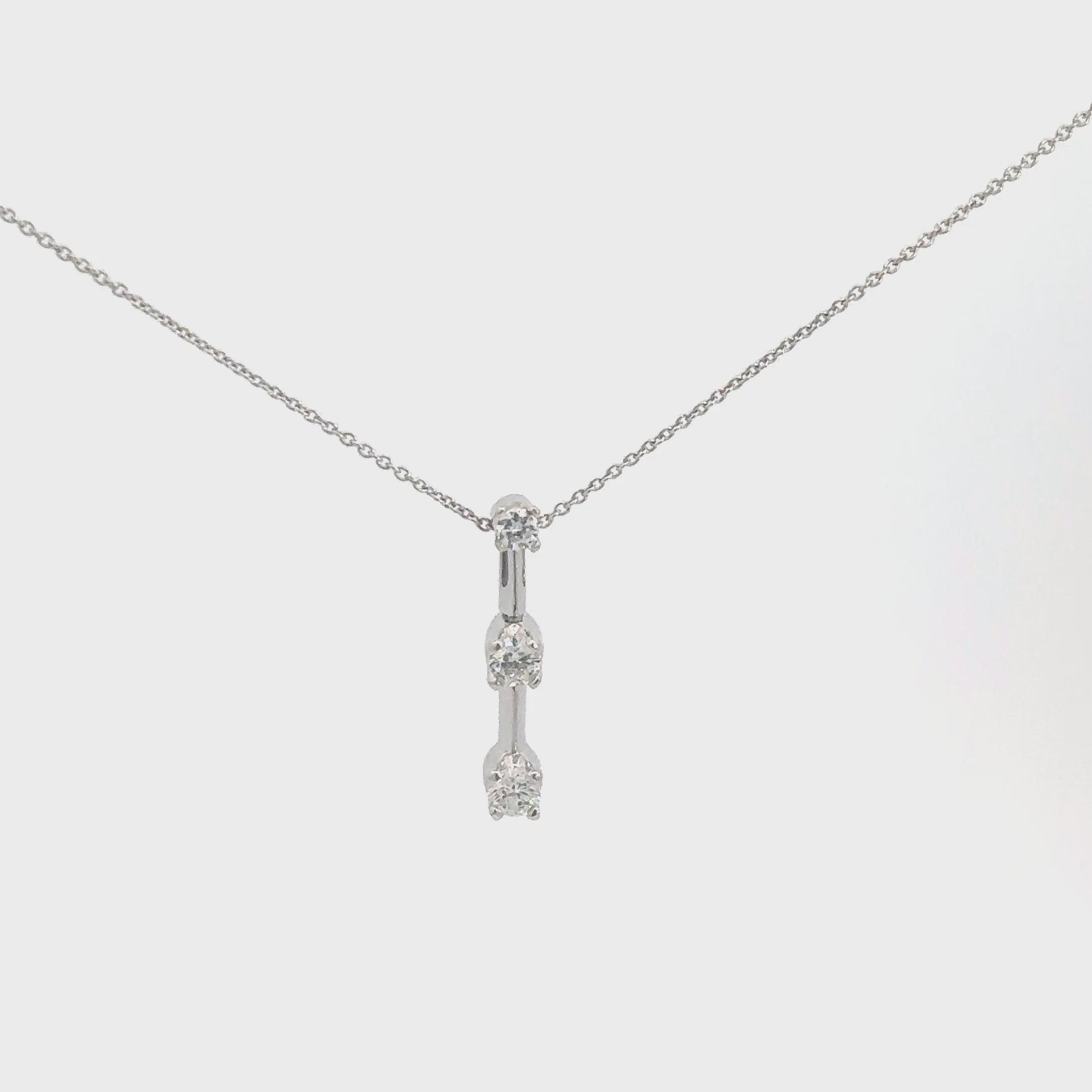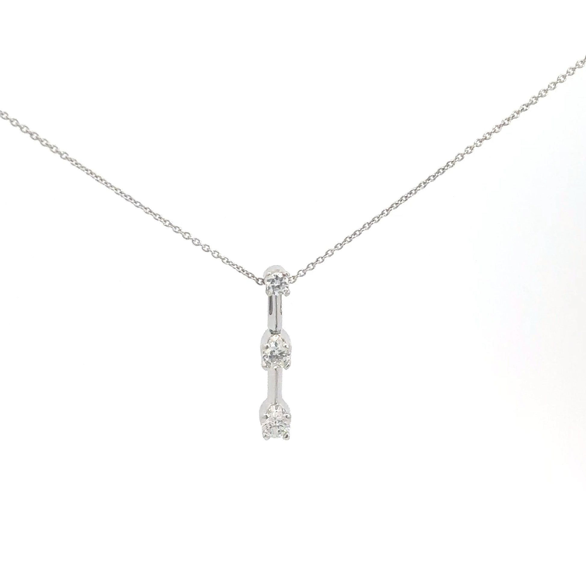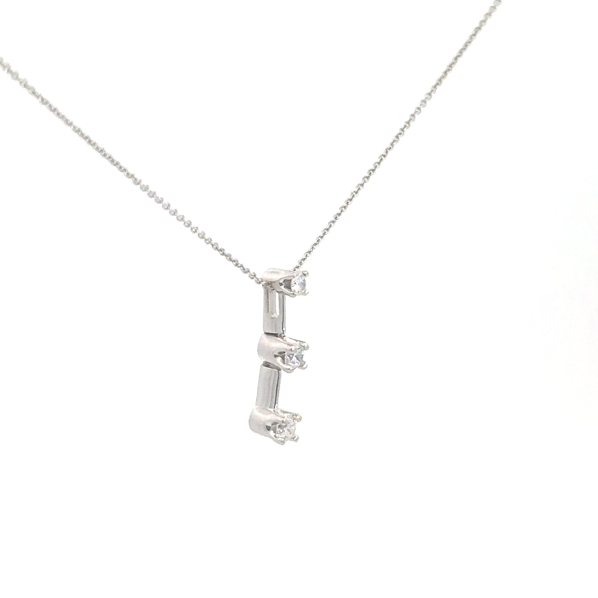 This elegant 14k white gold pendant features three round brilliant diamonds arranged from smallest to largest. Together, they total approximately 0.25 carats, showcasing SI2 clarity and a near-colorless G-H body color. Perfect for symbolizing cherished moments, this pendant combines timeless beauty with meaningful design.