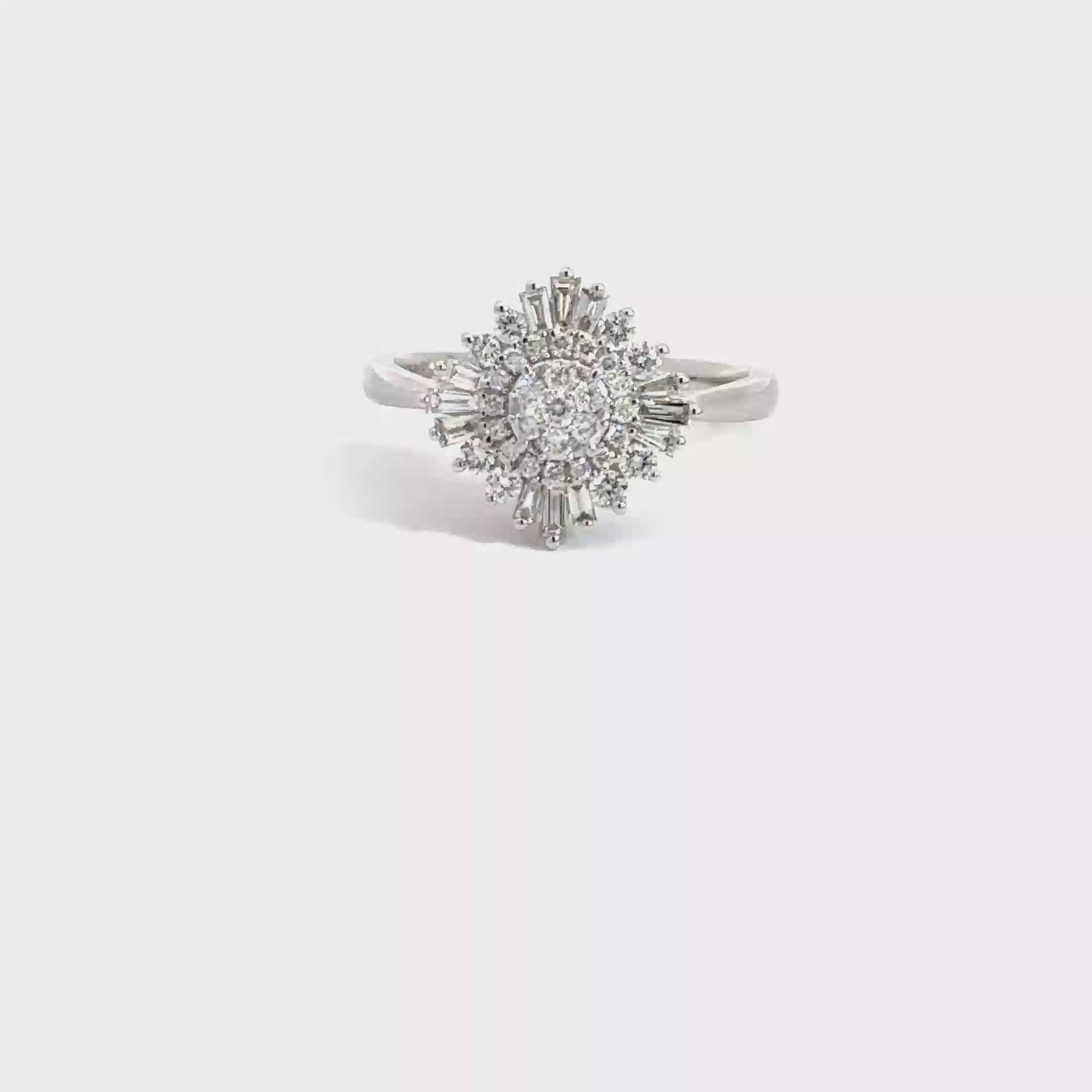 This exquisite lady's ring is made of 14k white gold and features a stunning cluster of round brilliant diamonds and baguette diamonds. A total of 49 diamonds with a combined weight of approximately 1cttw adorn this ring, each with a clarity of SI1-SI2 and a body color of (G-H).