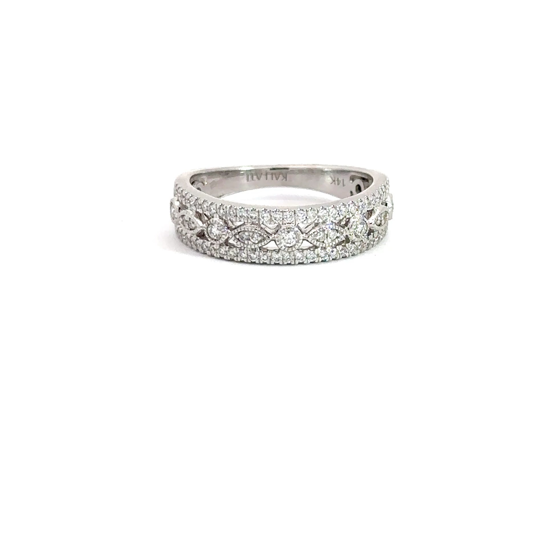 Crafted in 14k white gold, this ring boasts a multi shaped appearance band that is accented with round brilliant diamonds and milgrain design. The diamonds have a combined weight of approximately .50ctttw, featuring a clarity range of VS-SI and a body color of (E-F).