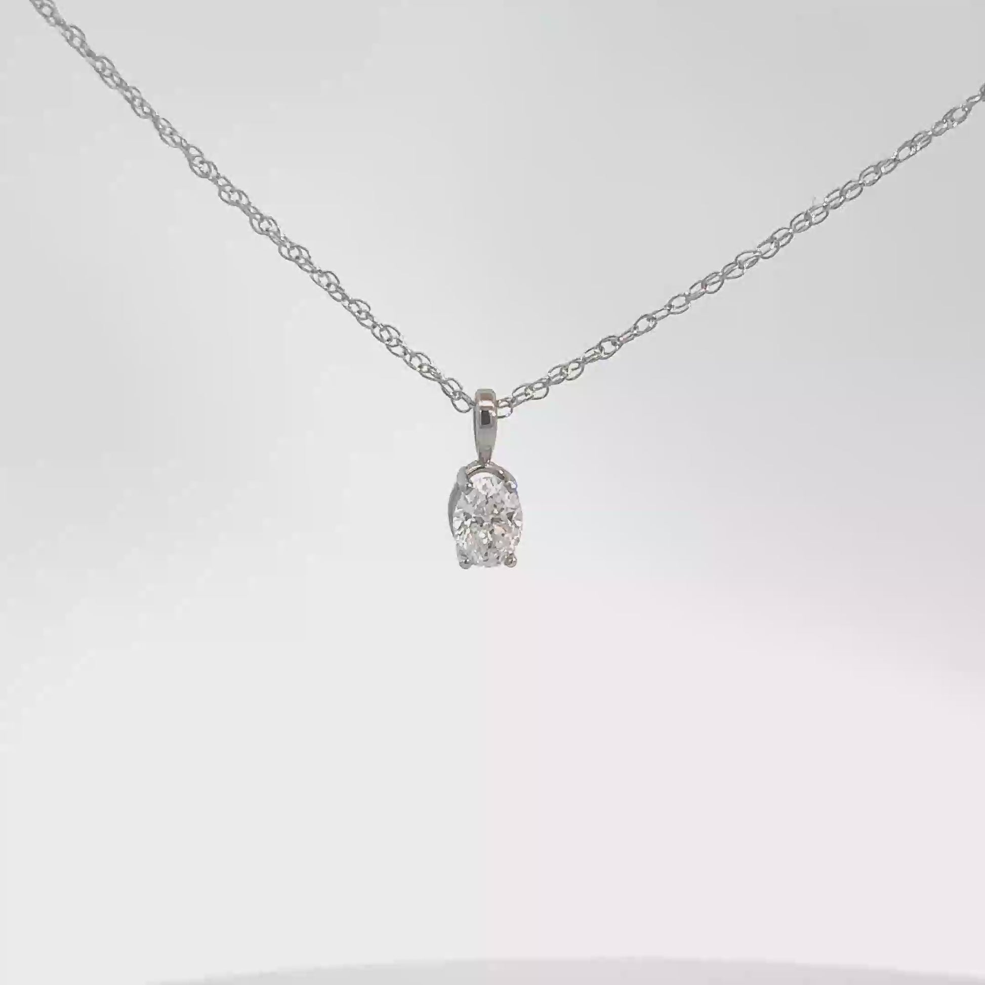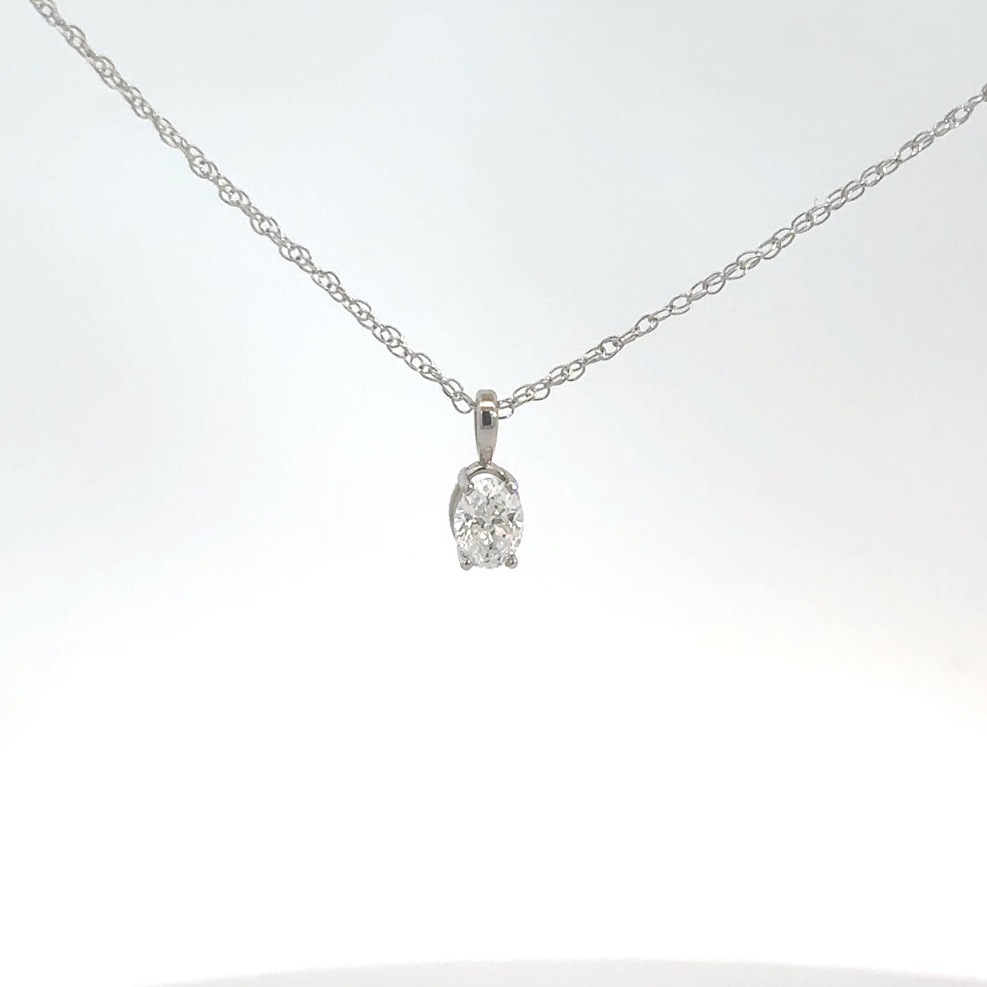 Crafted from 14k white gold, this diamond pendant features a stunning oval solitaire with an approximate total weight of .50cttw.