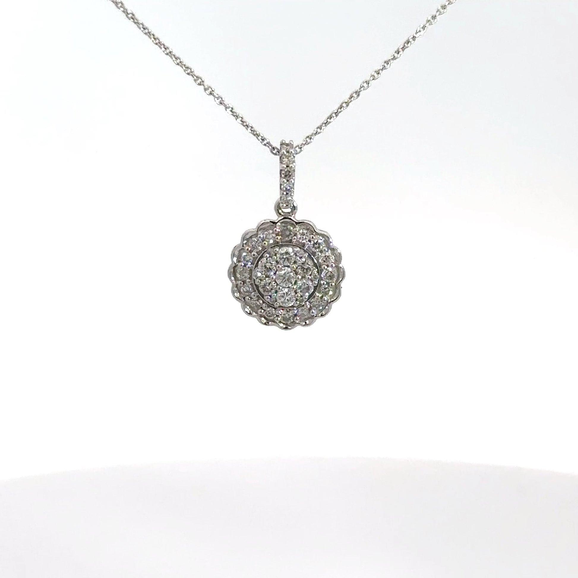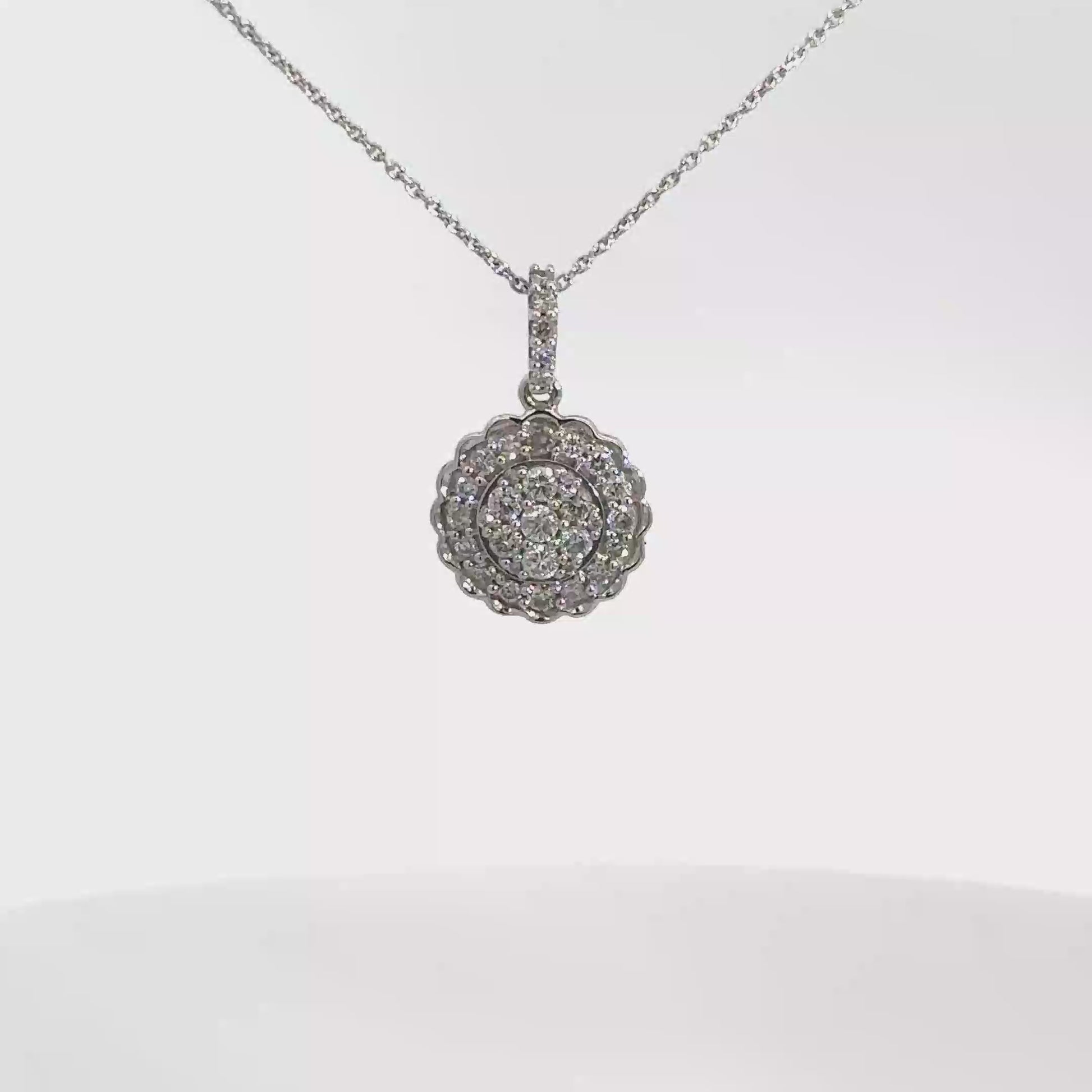 The 14k white gold .62cttw diamond cluster pendant features a cluster of round brilliant diamonds surrounded by a halo. This pendant has a clarity ranging from SI1 to I1 and a body color of (F-G), giving it an approximate total weight of .62cttw.