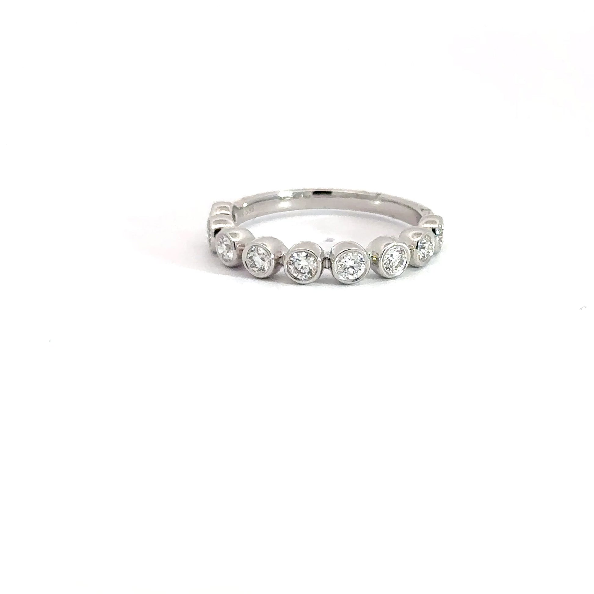 14k white gold diamond ring. This ring consists of 9 round brilliant diamonds. The diamonds are bezel set with an approximate weight of .50cttw with a clarity of SI1-SI2 and a body color of (G-H).