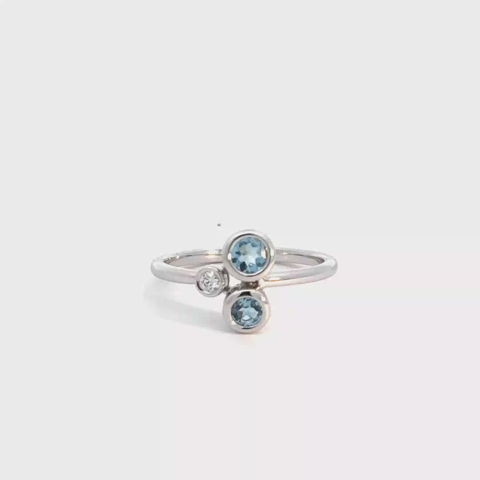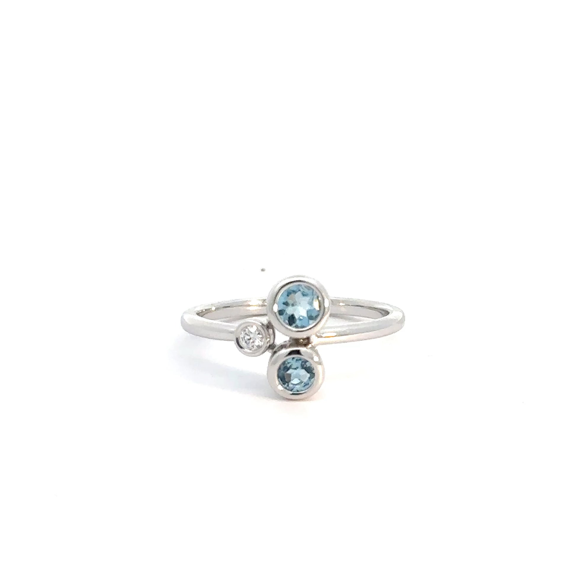 This 14k white gold ring features a stacked design with two bezel set aquamarines and a bezel set round brilliant diamond on the side. The diamonds have a total weight of approximately .03cttw.