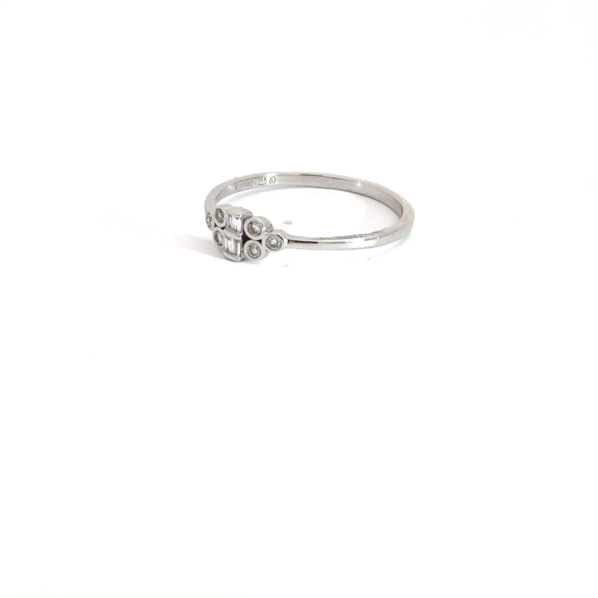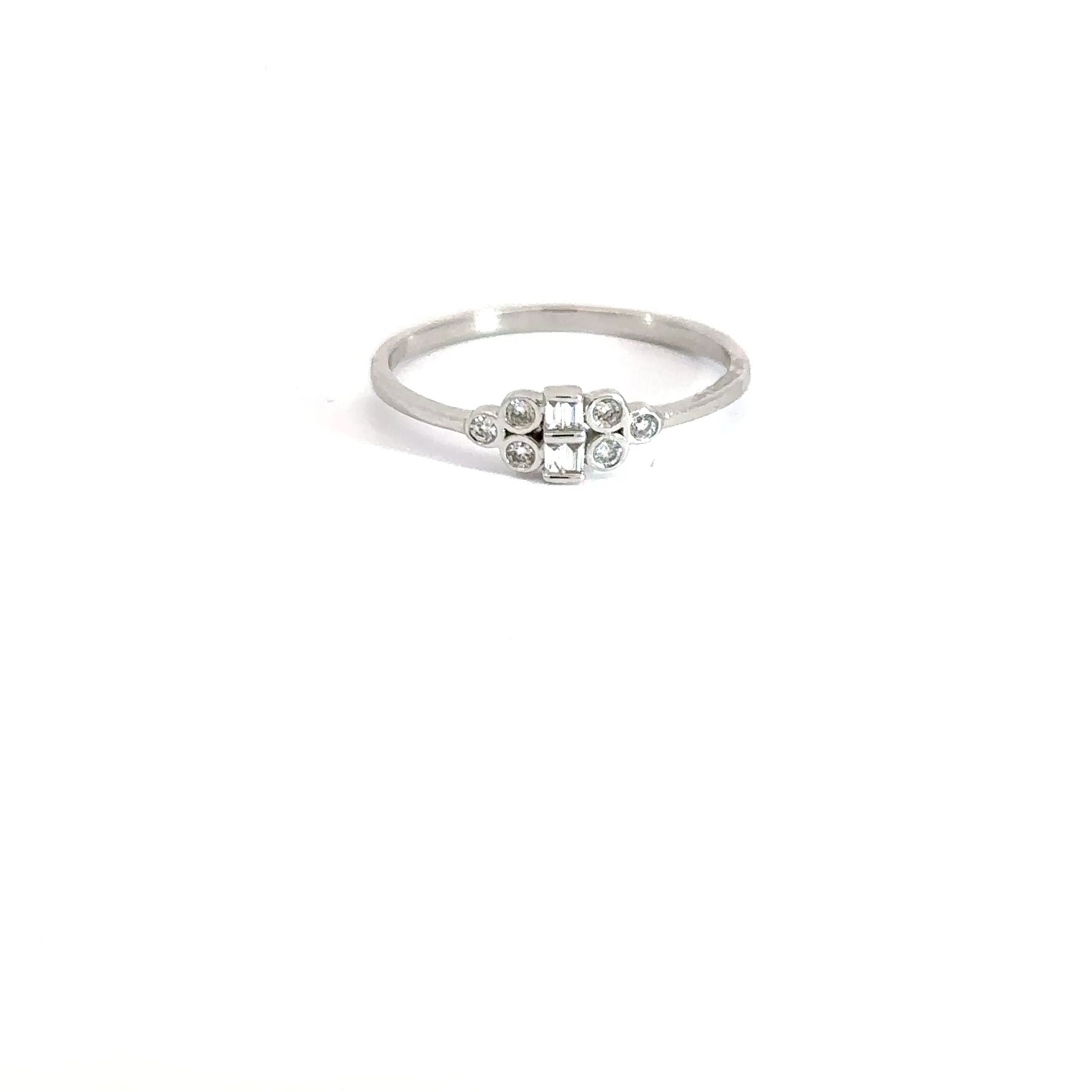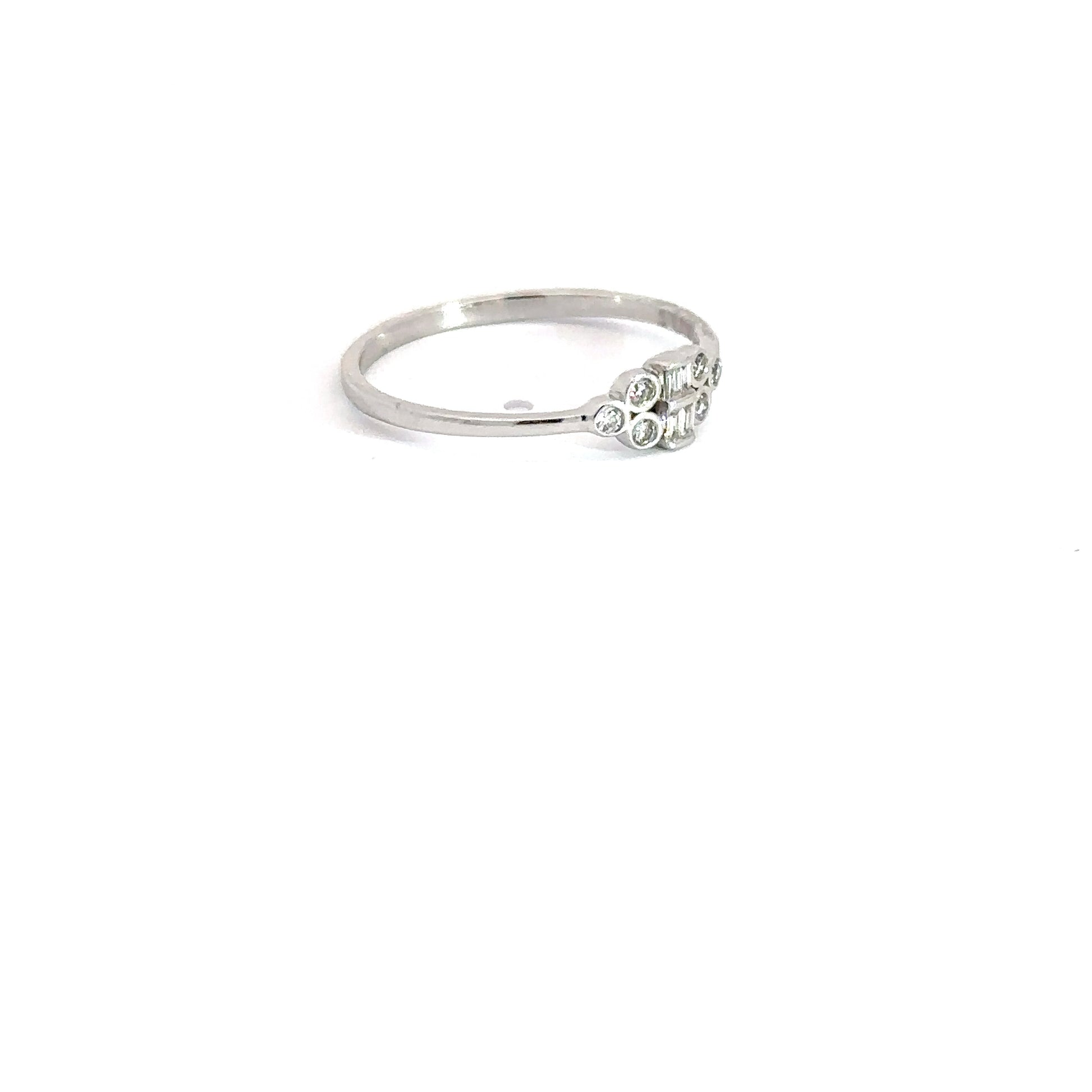 Expertly crafted from 14k white gold, this exquisite diamond ring features four mesmerizing baguettes, delicately stacked two by two, and three stunning round diamonds set in a bezel on either side. With a total weight of approximately .12cttw, these diamonds boast a clarity of SI1 and a body color range of F-G, adding a touch of elegance and sophistication to any ensemble.