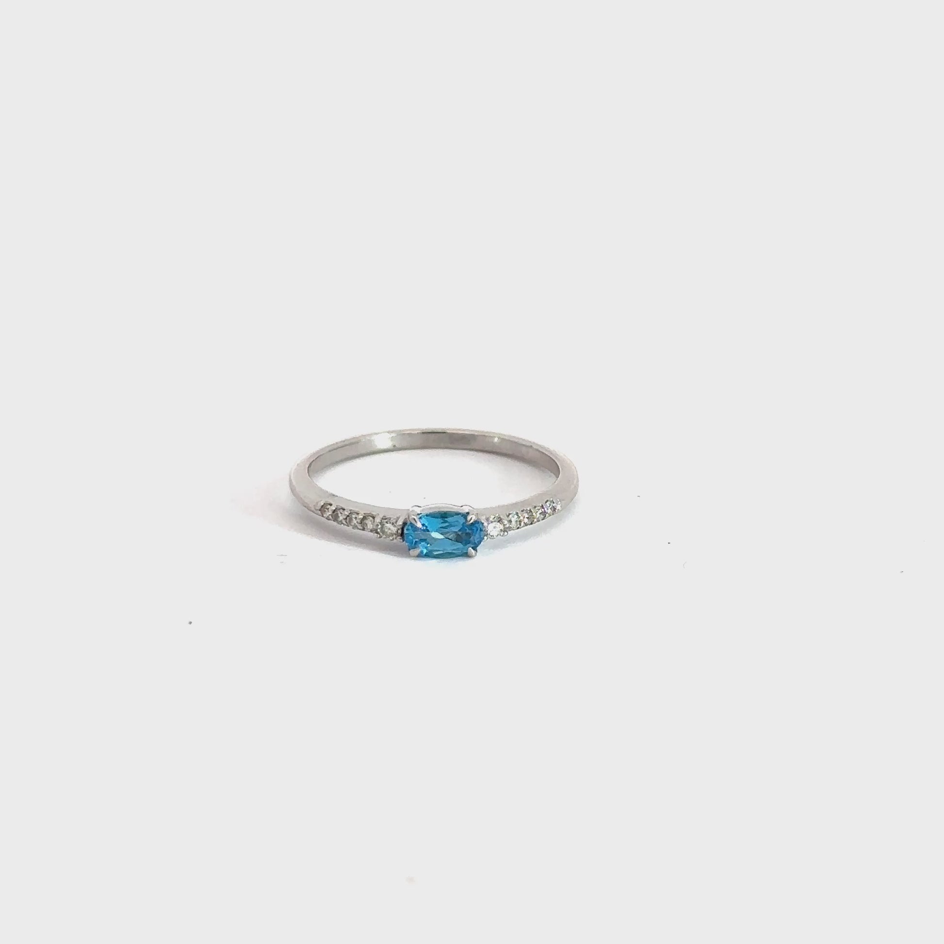 This stunning 14k white gold ring features an oval-shaped 5x3mm blue topaz flanked by round brilliant diamonds on either side, with a combined weight of approximately .06cttw.