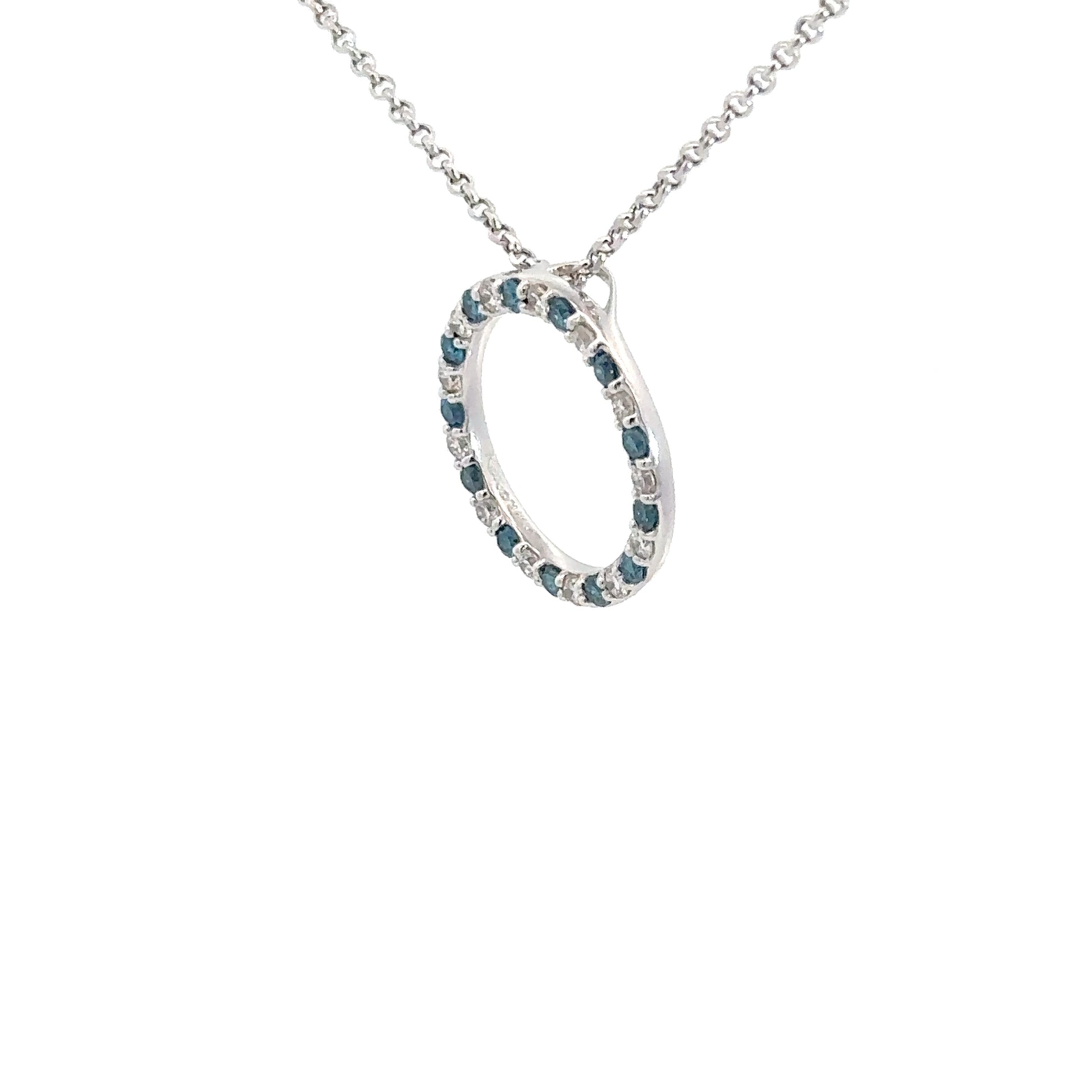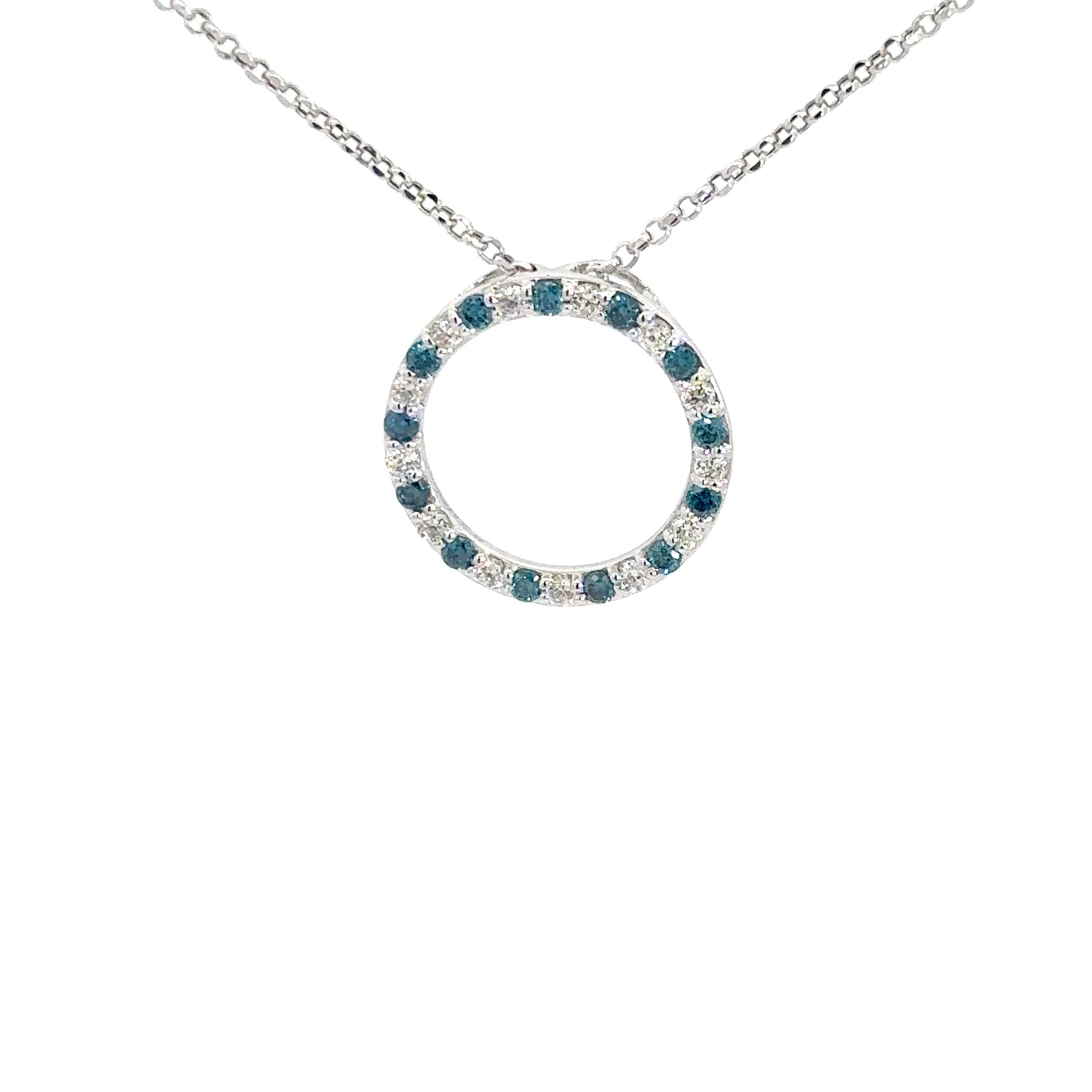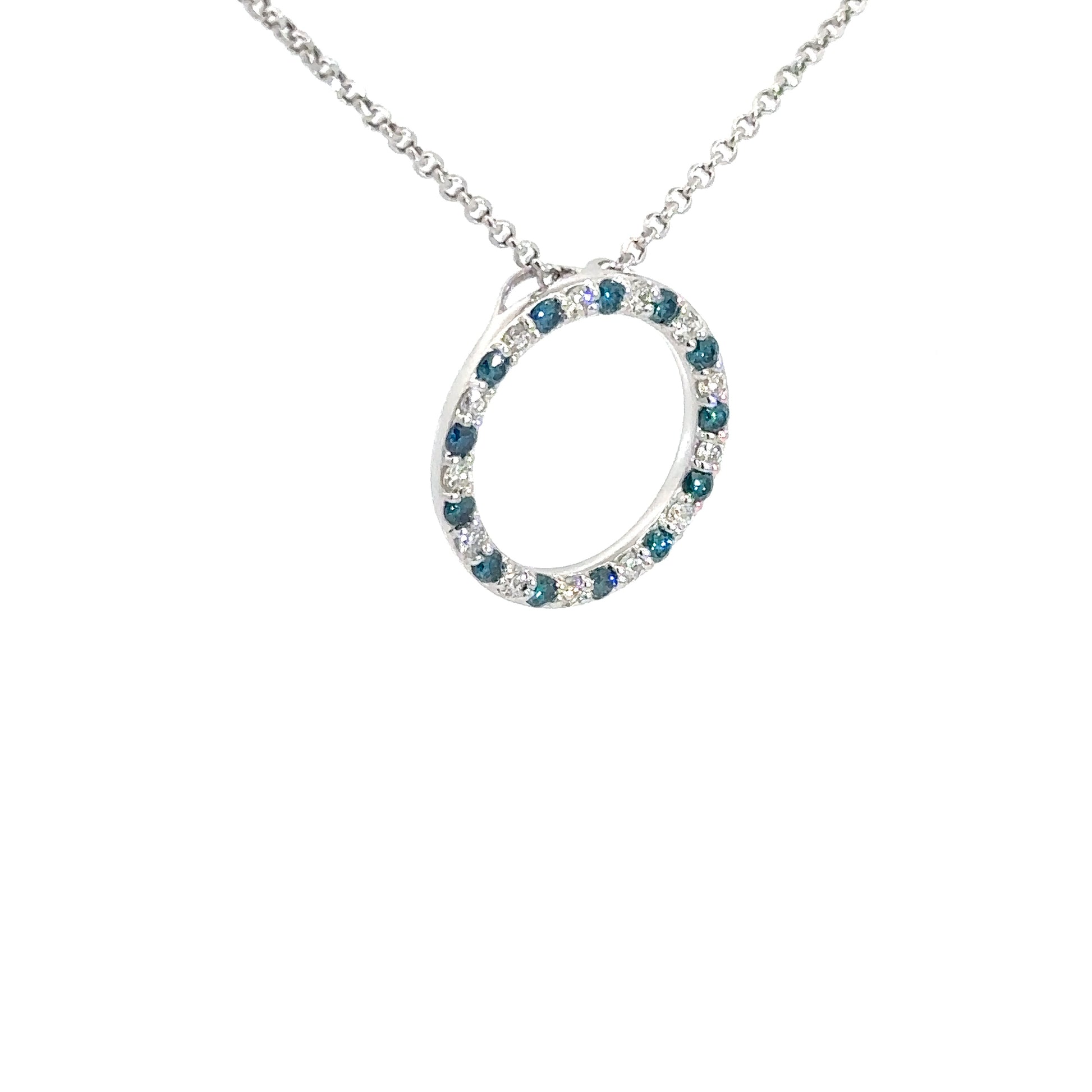 This elegant 14k white gold pendant features a circle design adorned with alternating blue and white diamonds. The diamonds total approximately 3/4 carats, boasting SI1 clarity and a bright F-G color grade, creating a striking and sophisticated accessory.
