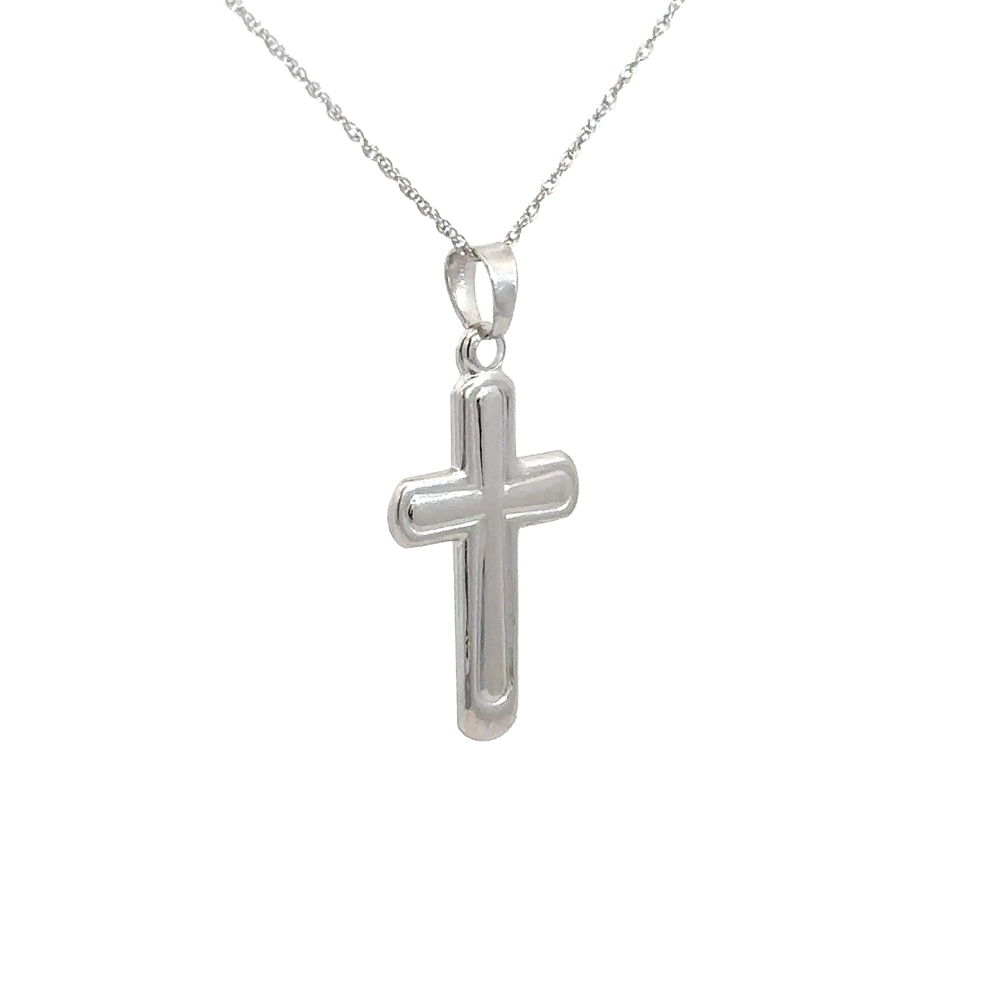 This 14k white gold cross features a finely etched outline, combining elegance with timeless appeal.