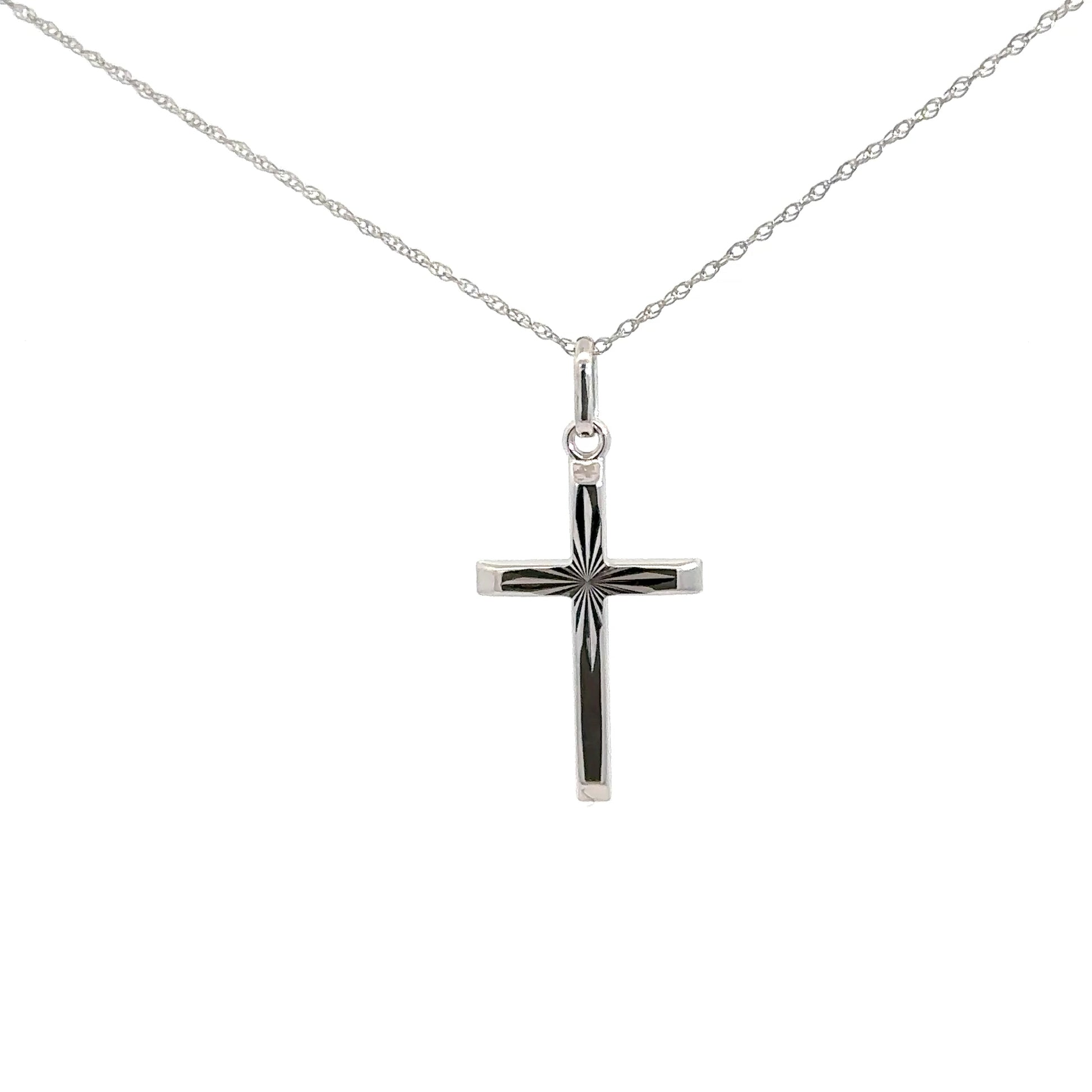 This 14k white gold cross features a stunning diamond-cut pattern at its center, adding a touch of elegance and brilliance to a timeless symbol.