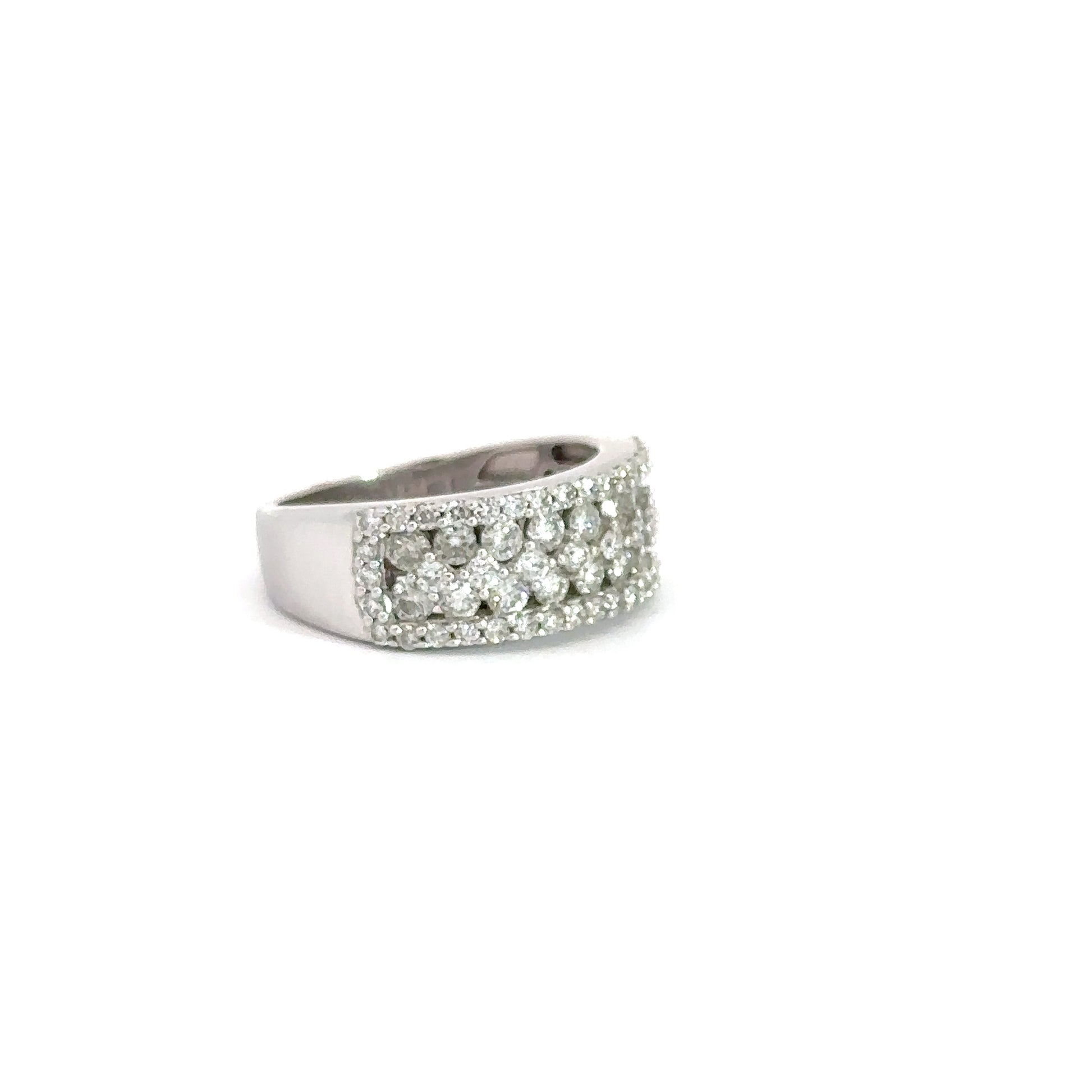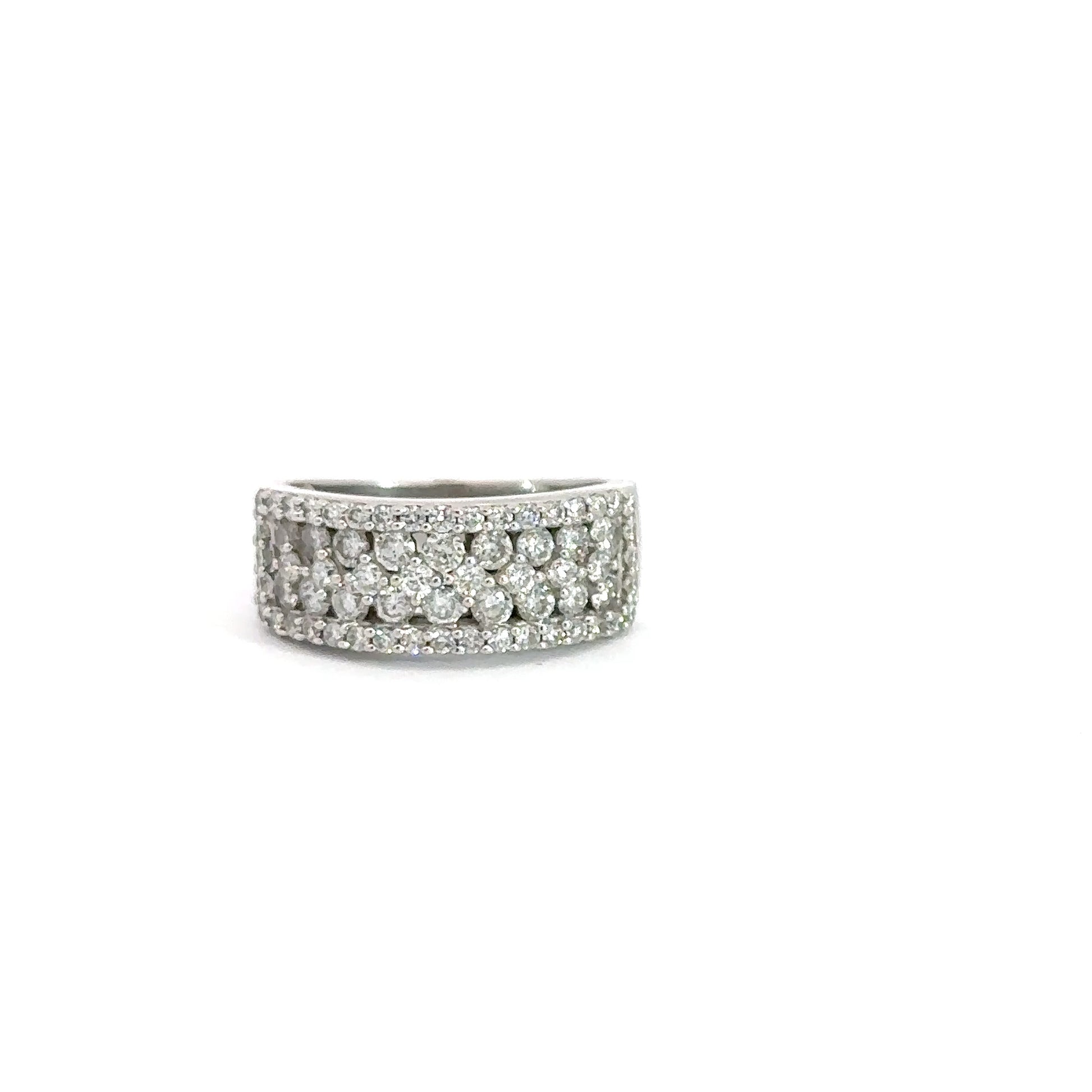 This 14k white gold diamond band features 5 rows of round diamonds in different sizes, totaling approximately 1 3/4cttw. The diamonds have a clarity of VS and a body color of (E-F).