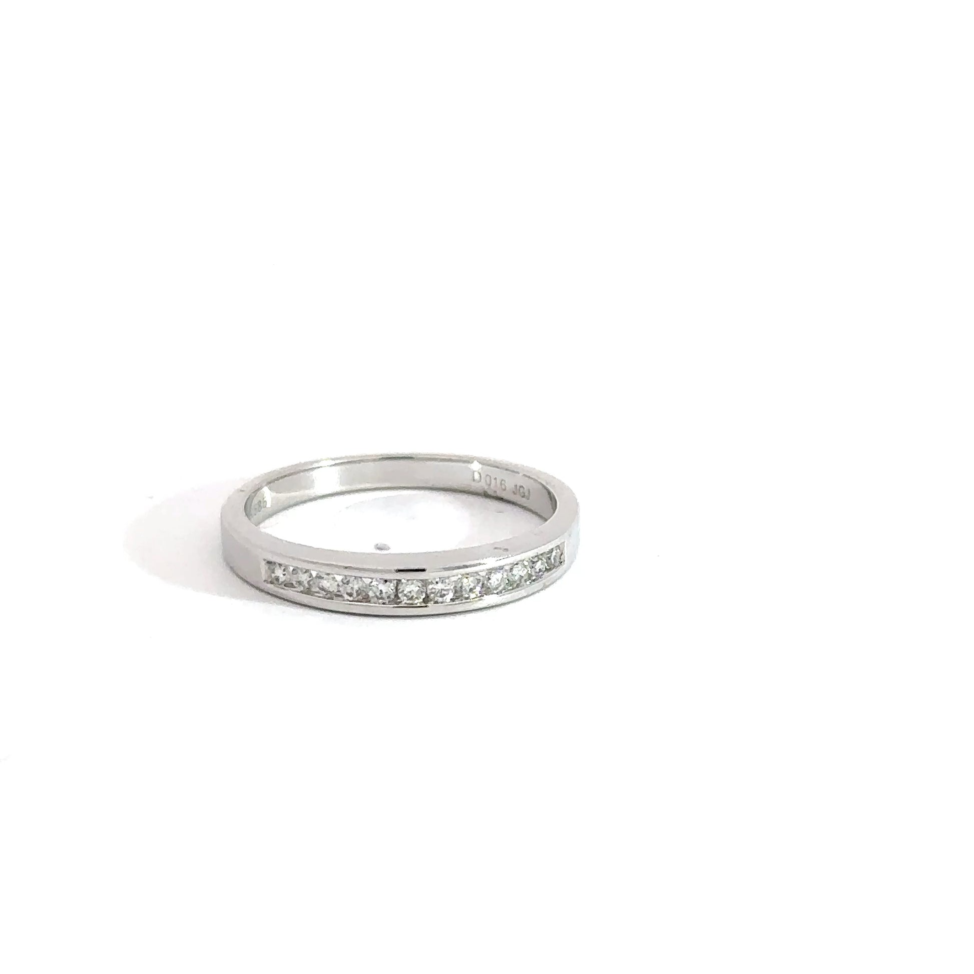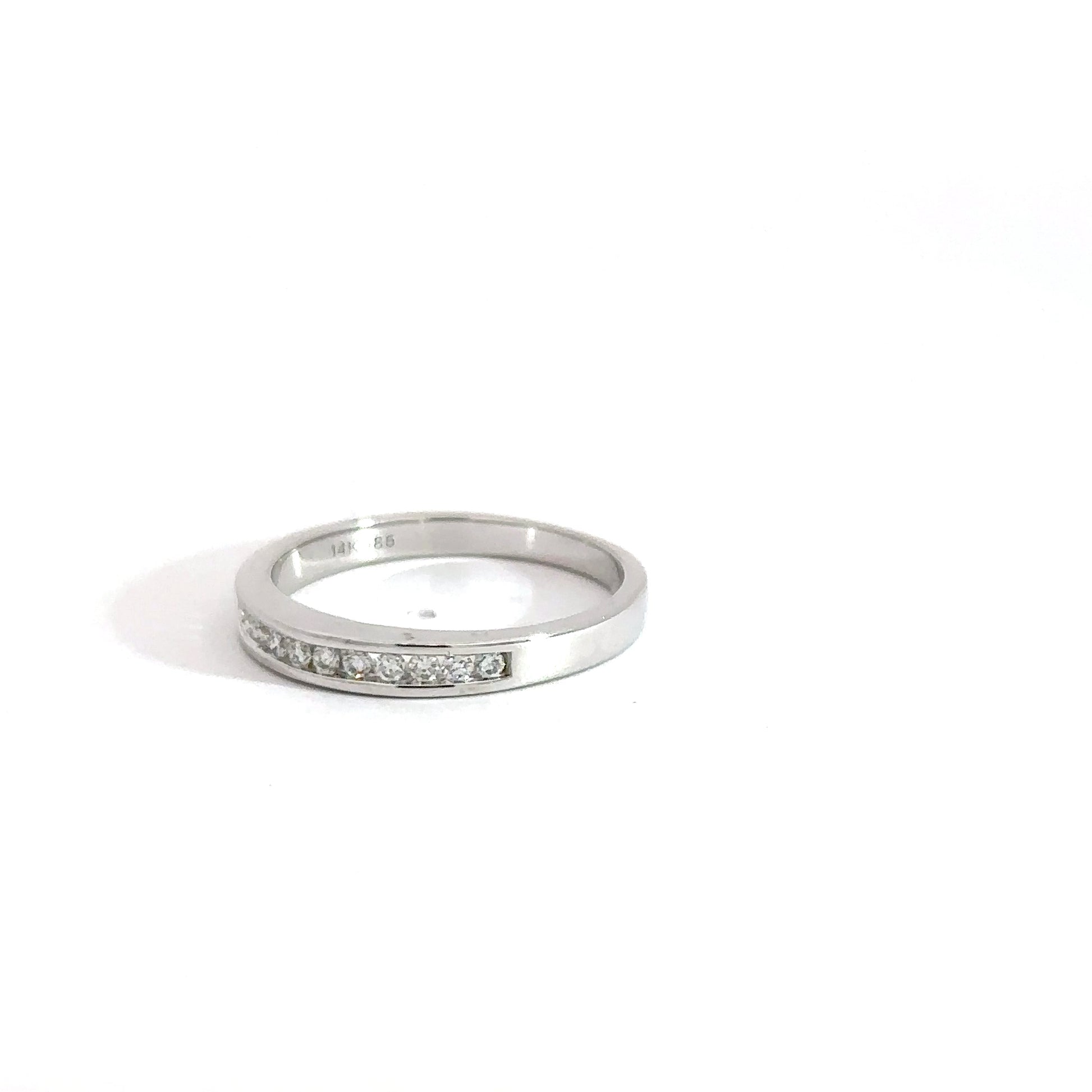 This elegant 14k white gold band features 12 sparkling round brilliant diamonds, collectively weighing approximately 0.12 carats, designed to add a touch of timeless sophistication to any look.