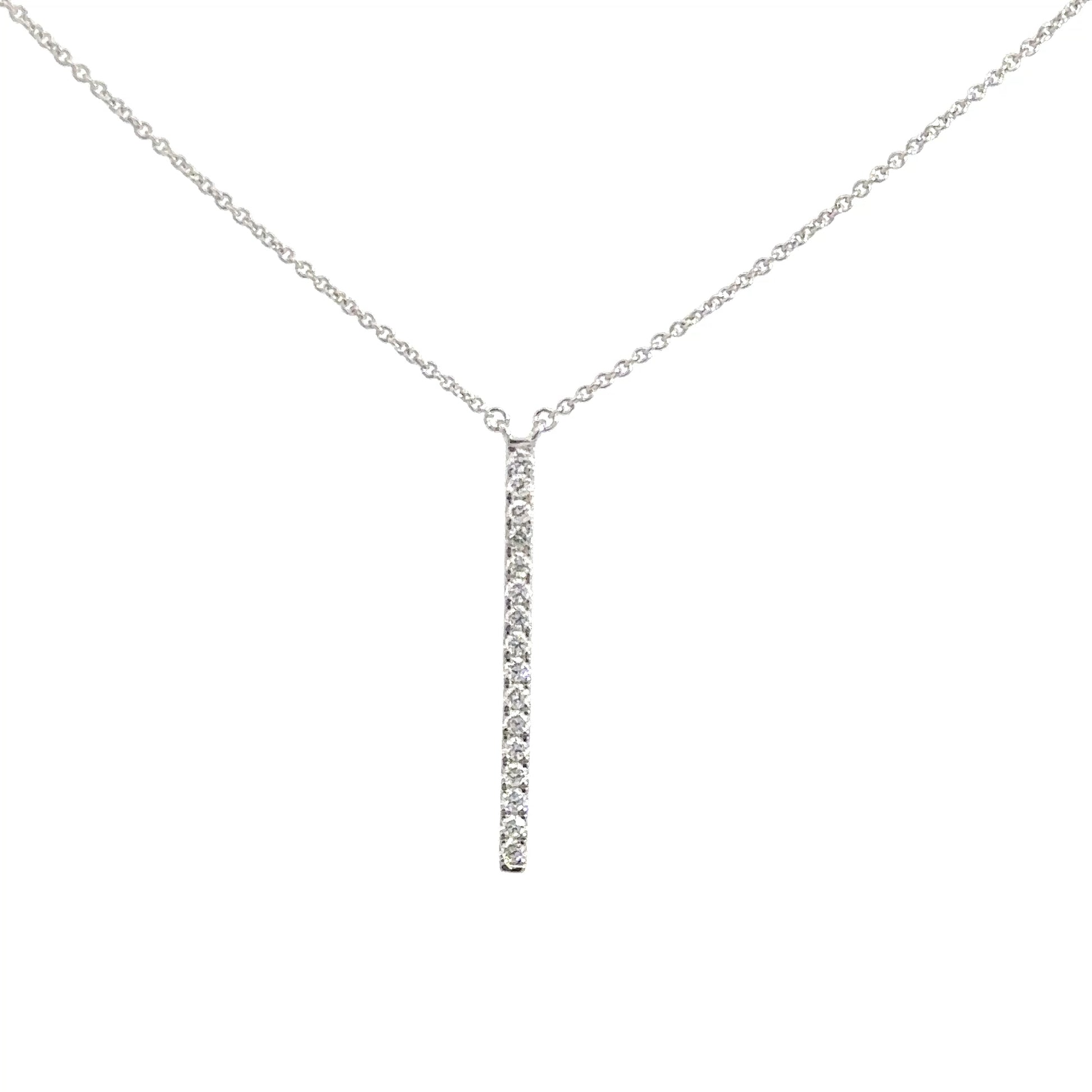 This elegant 14k white gold bar features round brilliant diamonds arranged vertically. The diamonds total approximately 1/4 carat, showcasing VS clarity and a stunning E-F body color, making it a dazzling addition to any jewelry collection.