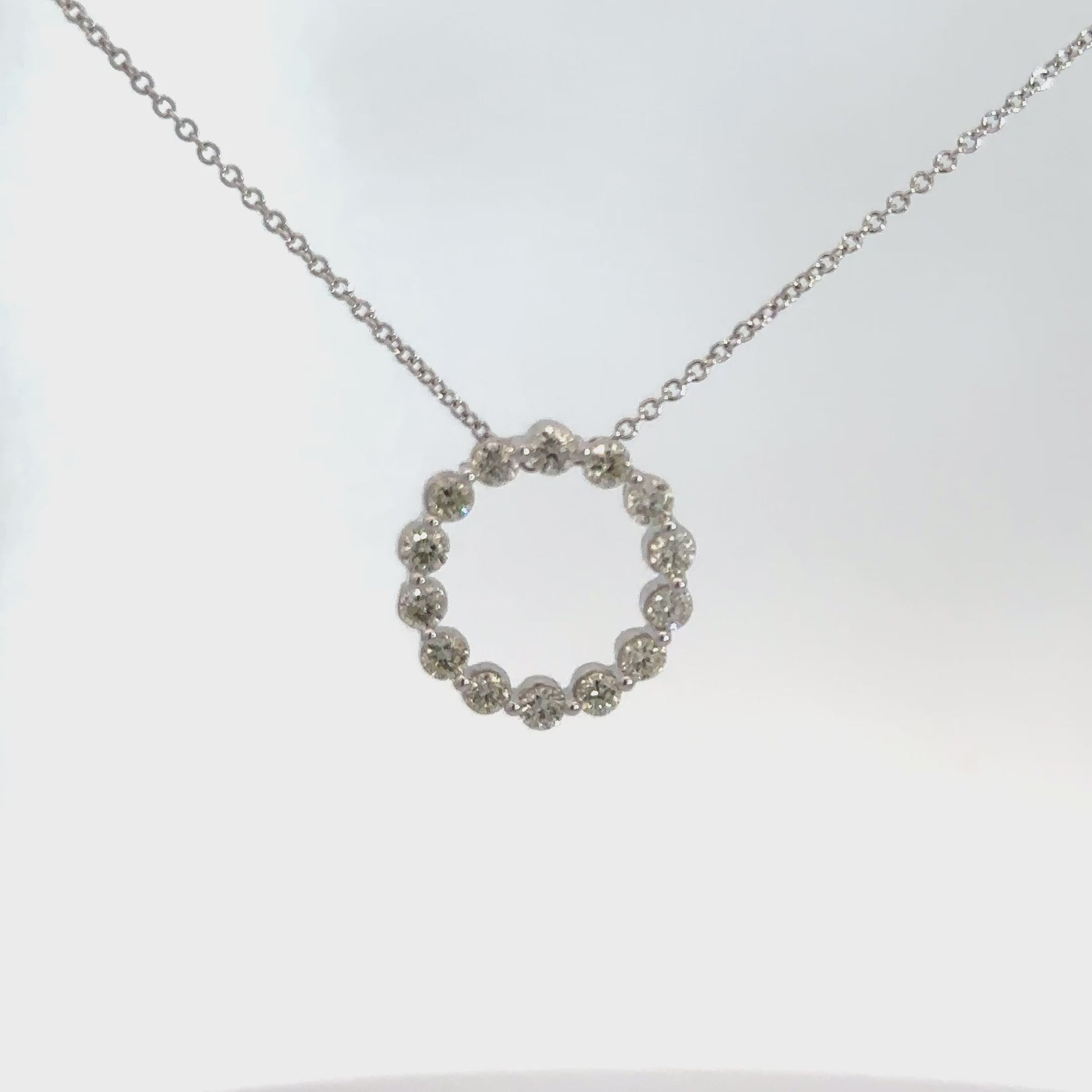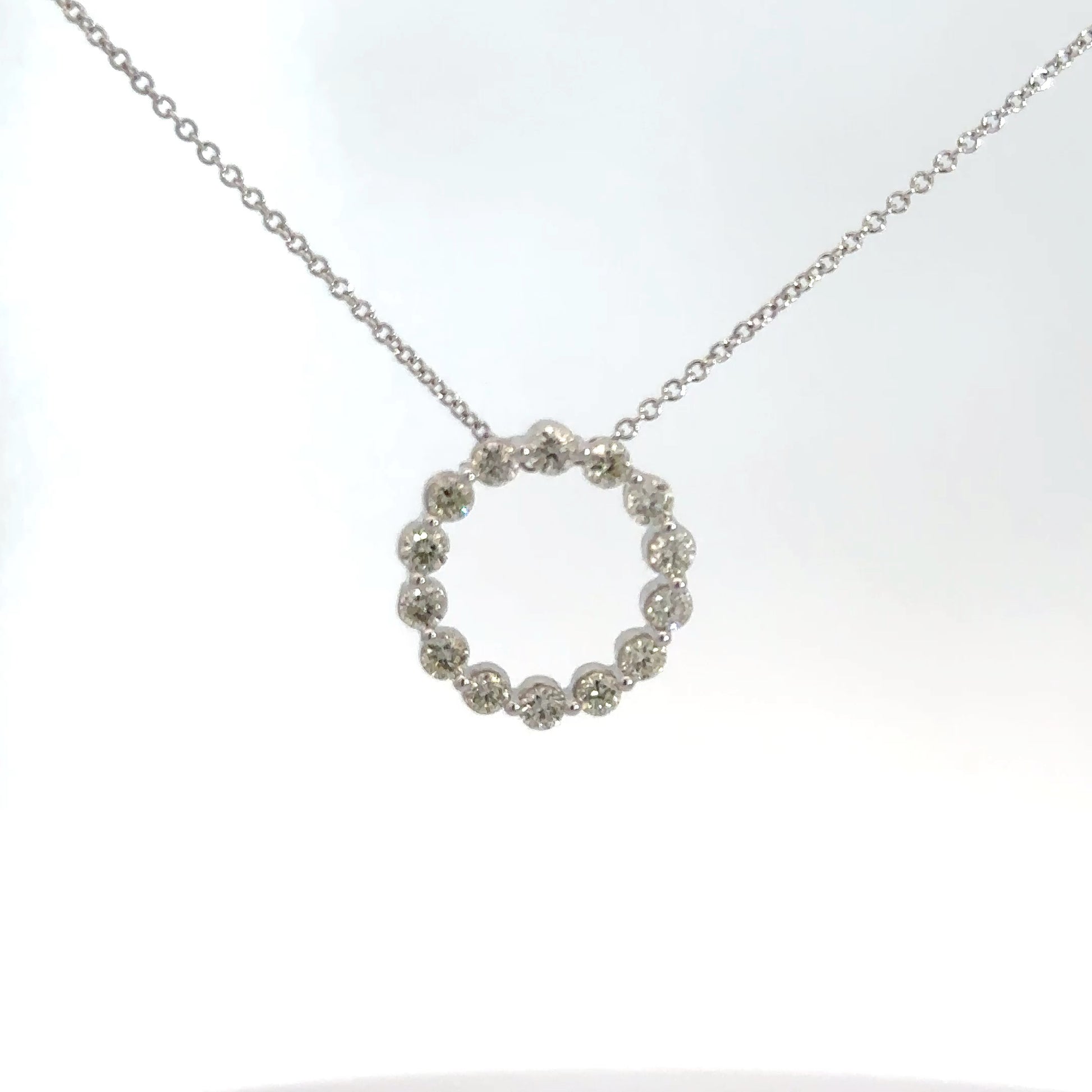 This 14k white gold diamond circle pendant features 14 round brilliant diamonds with an estimated weight of 1cttw. The diamonds have a SI2 clarity and a body color of (G-H).