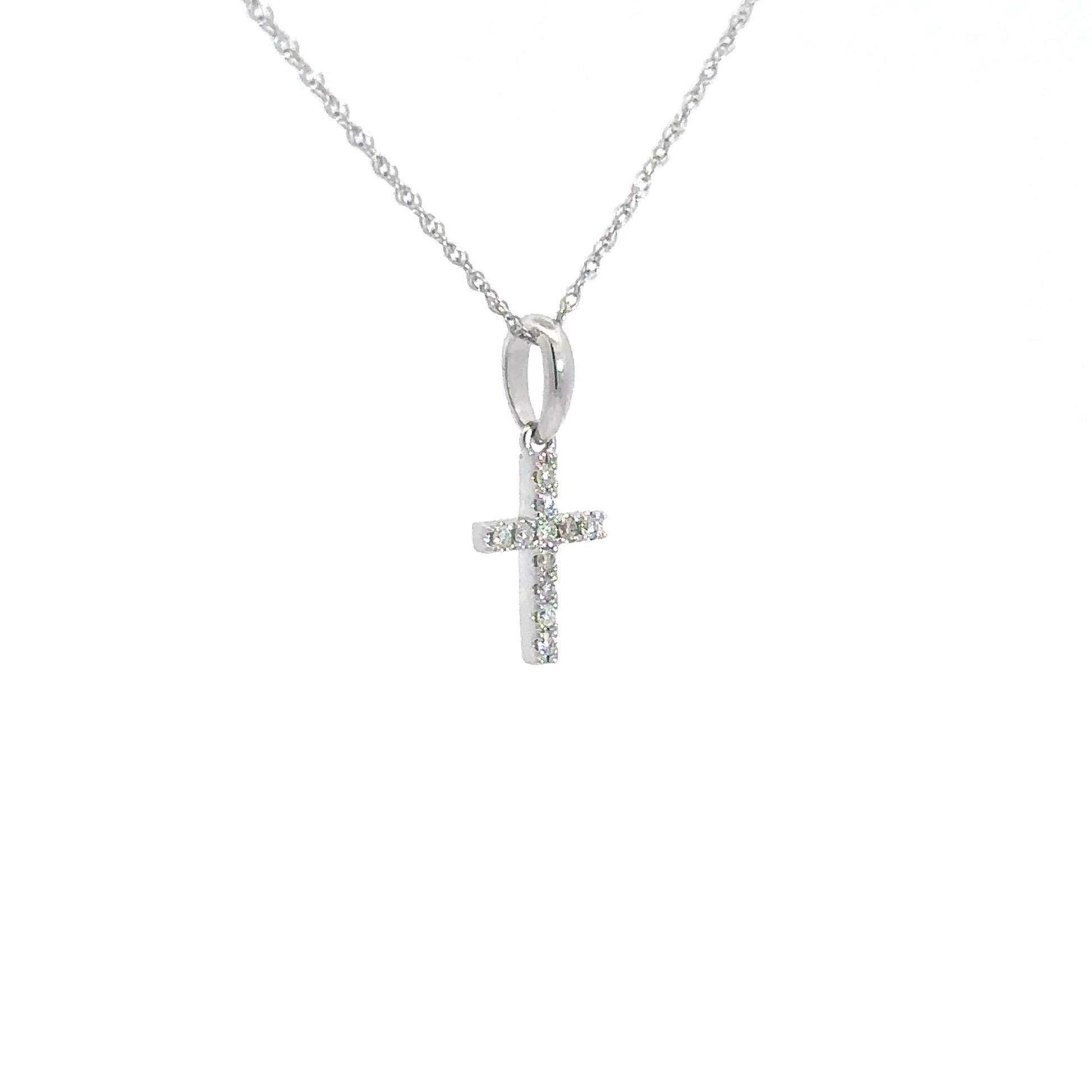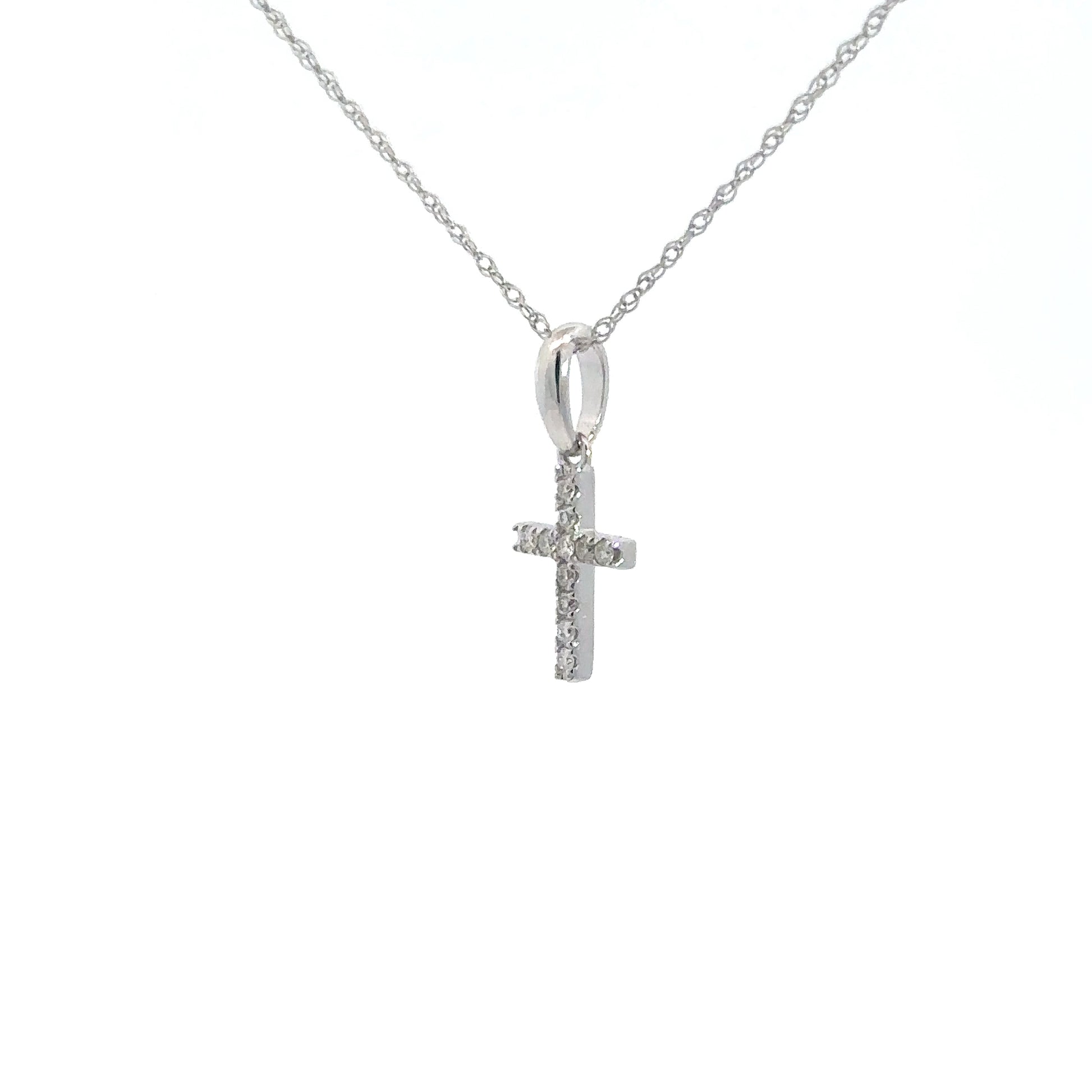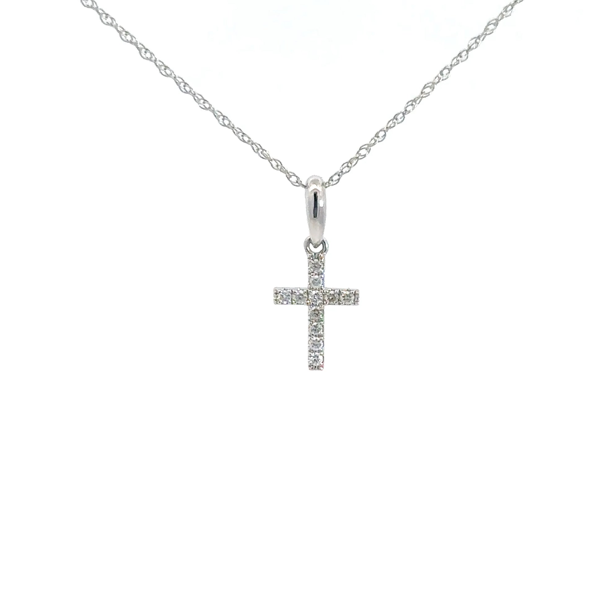This elegant lady’s cross is crafted from 14k white gold and adorned with 11 sparkling round brilliant diamonds, totaling approximately 0.09 carats. Its refined design makes it a timeless piece to cherish or gift.
