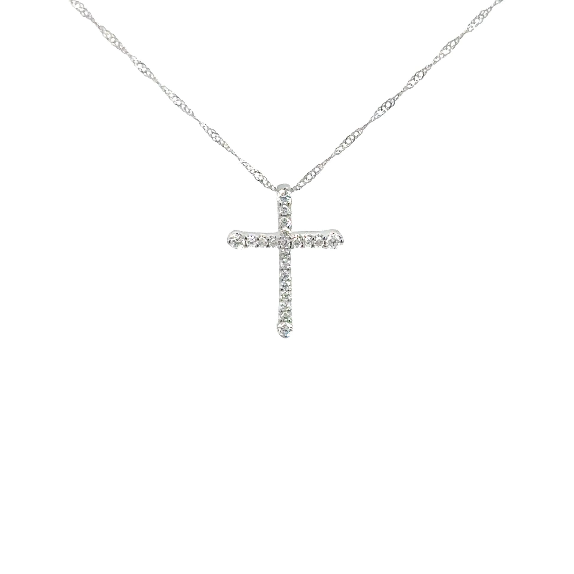 This elegant lady’s cross is crafted from 14k white gold and features 21 sparkling round brilliant diamonds, totaling approximately 1/5 carat. A timeless piece that combines classic design with dazzling brilliance.