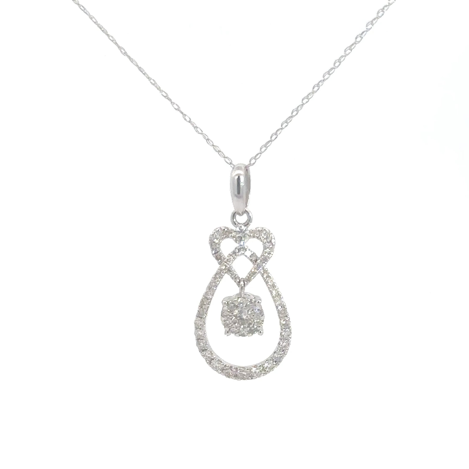 This elegant 14k white gold pendant features a captivating arrangement of 61 round brilliant diamonds, totaling approximately .58cttw. The diamonds are artfully set to create a heart shape intertwined with a delicate teardrop, highlighted by a graceful central dangle. Perfect for adding a touch of sophistication and sparkle to any outfit.