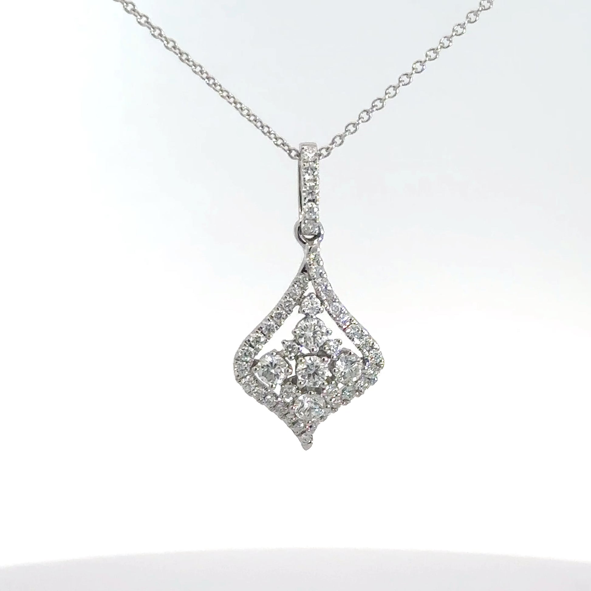 Lady's 14k white gold diamond pendant. This pendant consists of 45 round brilliant diamonds in a unique shape. This pendant has an approximate total weight of .62cttw with a clarity of SI1 and a body color of (F-G).