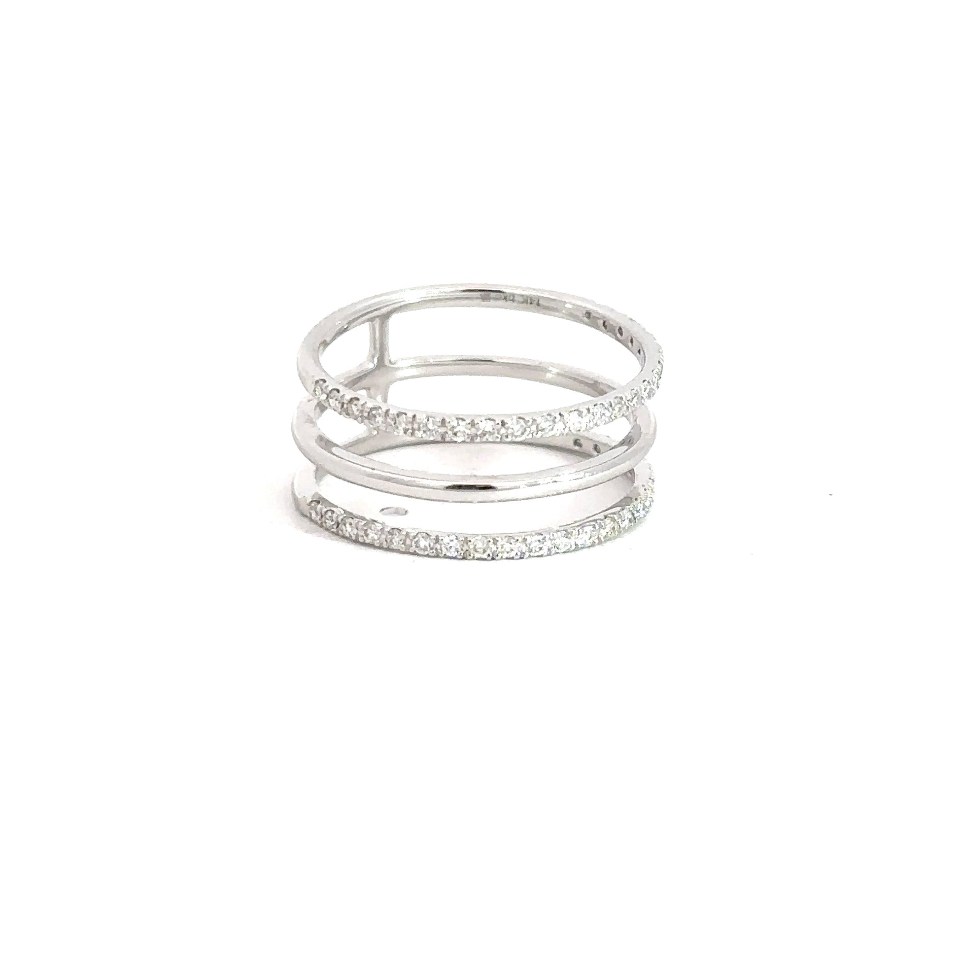 This elegant lady’s fashion ring is crafted from 14k white gold and features two outer rows of sparkling round brilliant diamonds totaling approximately .30 carats. A smooth white gold band in the center completes the stylish three-row design, creating a sophisticated piece perfect for any occasion.