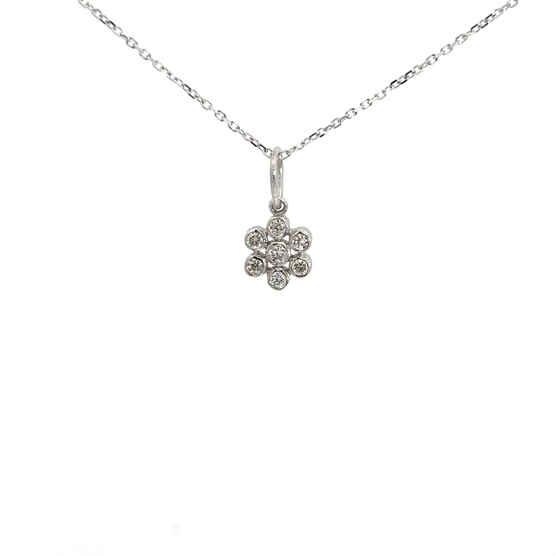 This elegant lady’s pendant features seven round brilliant diamonds set in 14k white gold, arranged beautifully in a delicate flower design. With a total diamond weight of approximately 0.18 carats, it adds a subtle sparkle that enhances any outfit with timeless charm.