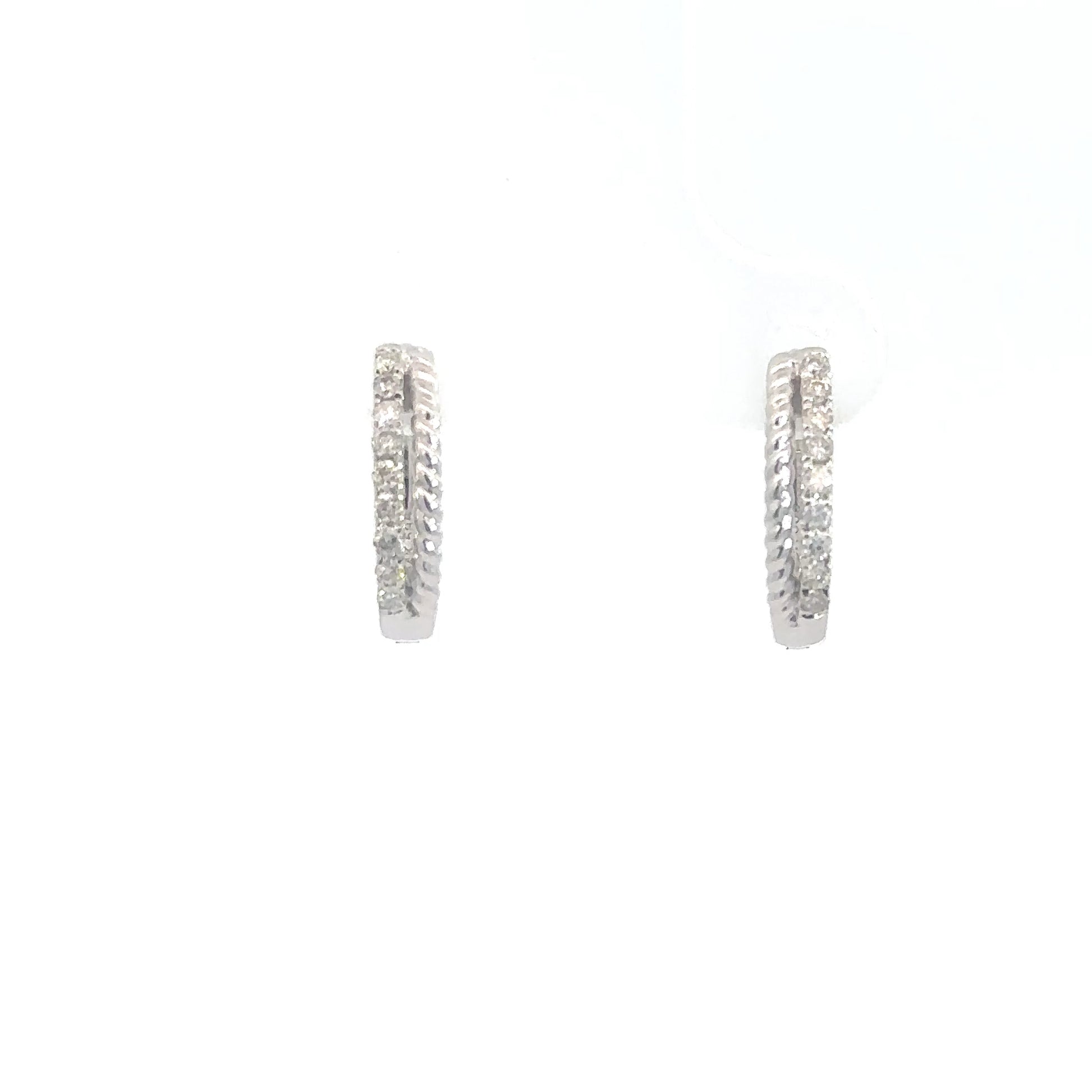 These elegant 14k white gold hoop earrings feature a unique twisted design on the secondary hoop. Each earring is adorned with 9 round brilliant diamonds, totaling approximately .16 carats, showcasing clarity of SI2 and a bright F-G color grade. Perfect for adding sparkle and sophistication to any look.