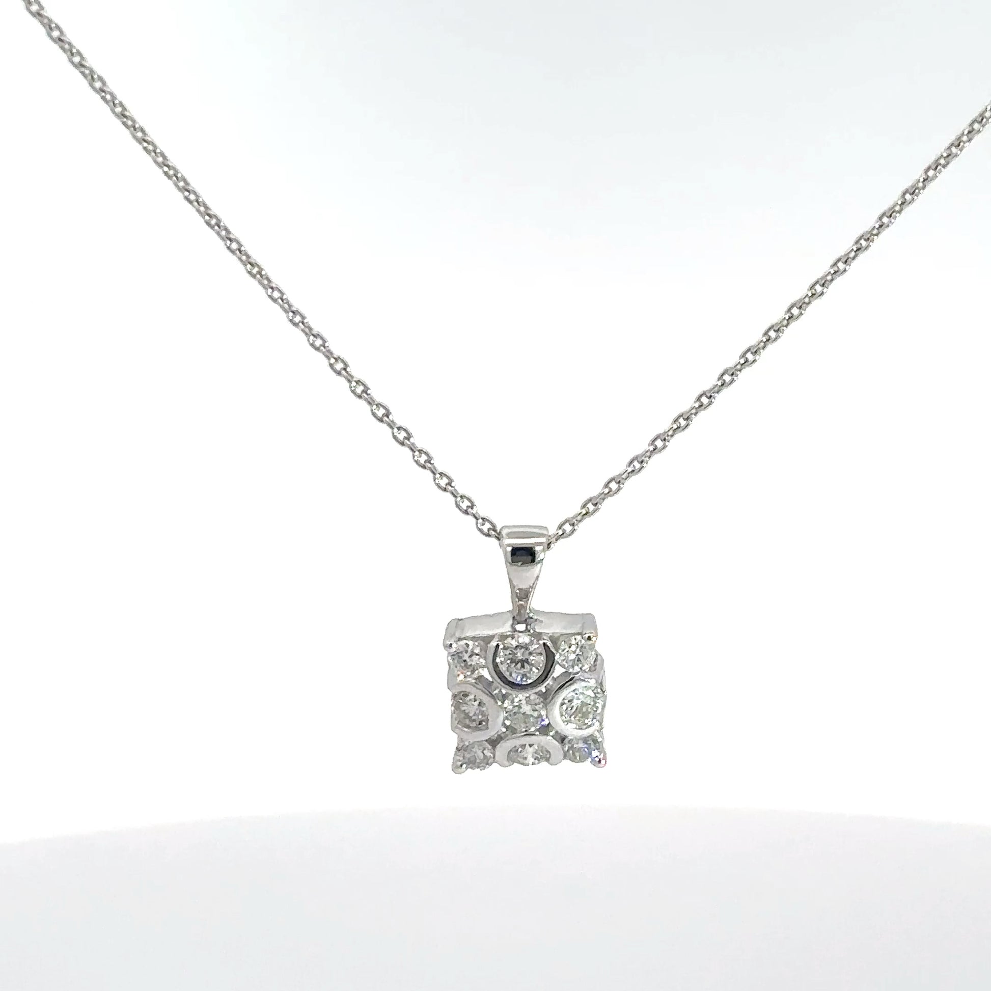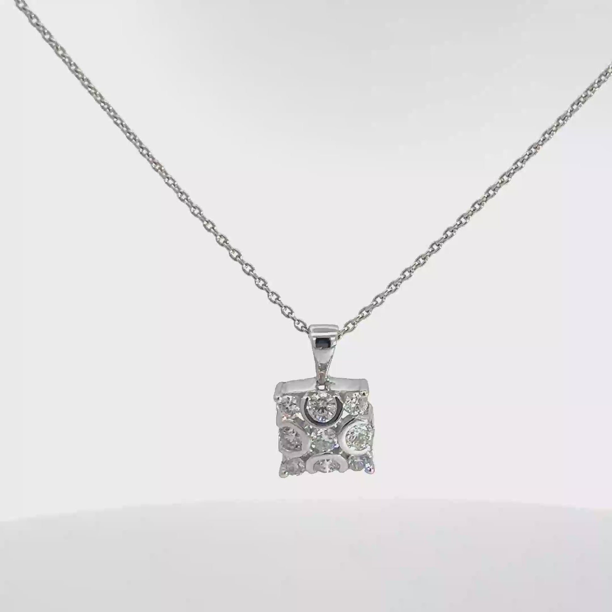 This pendant showcases a square arrangement of 9 round brilliant diamonds, all weighing approximately .38cttw. The diamonds have an SI1 clarity and a beautiful F-G body color. Made of 14k white gold.