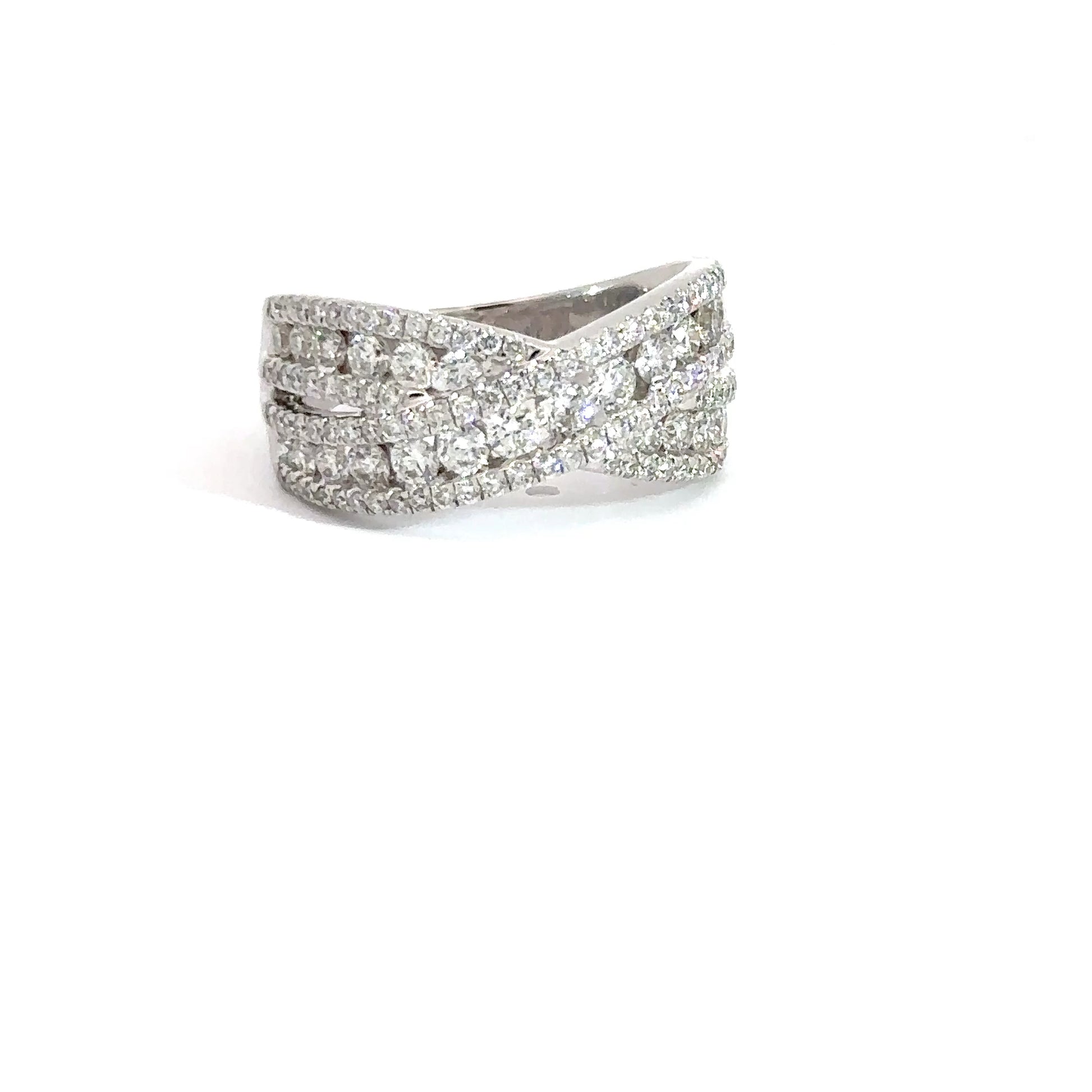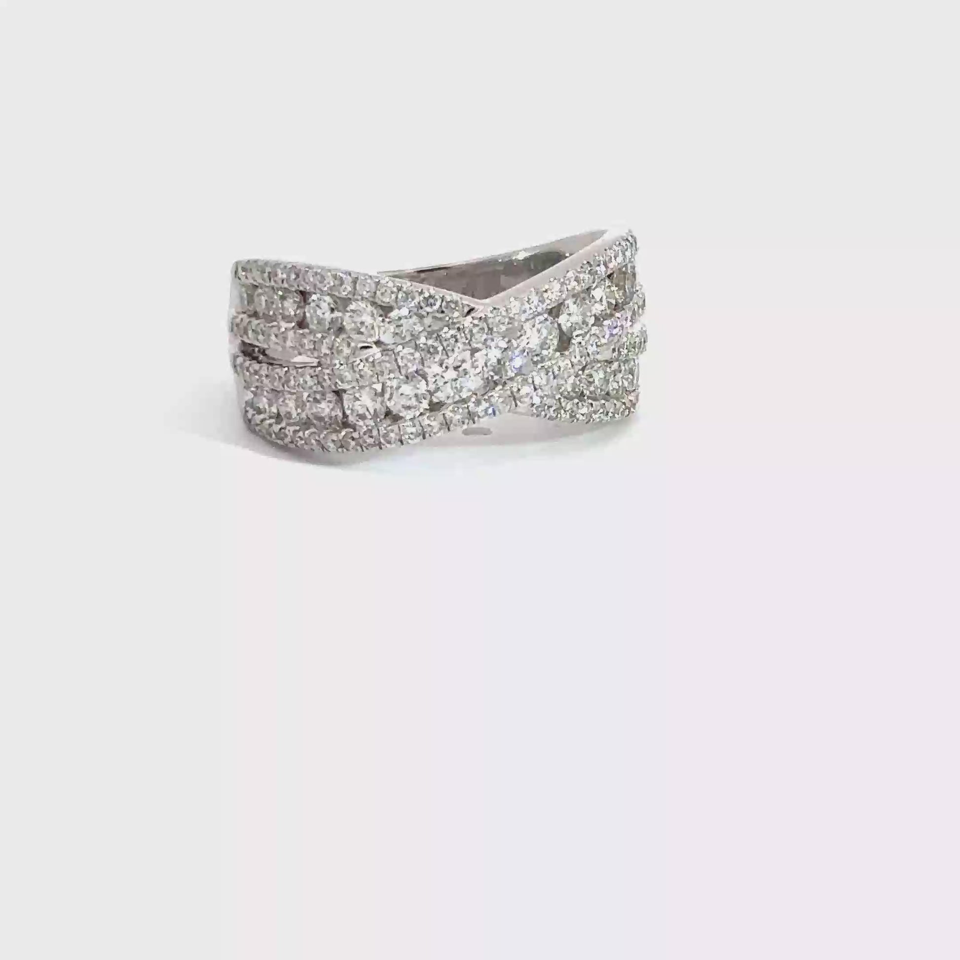 This 14k white gold diamond twist band contains round brilliant diamonds of various sizes that intersect at the center. The diamonds have a total weight of approximately 1.82cttw, with a clarity of VS2 and a color of (F-G).