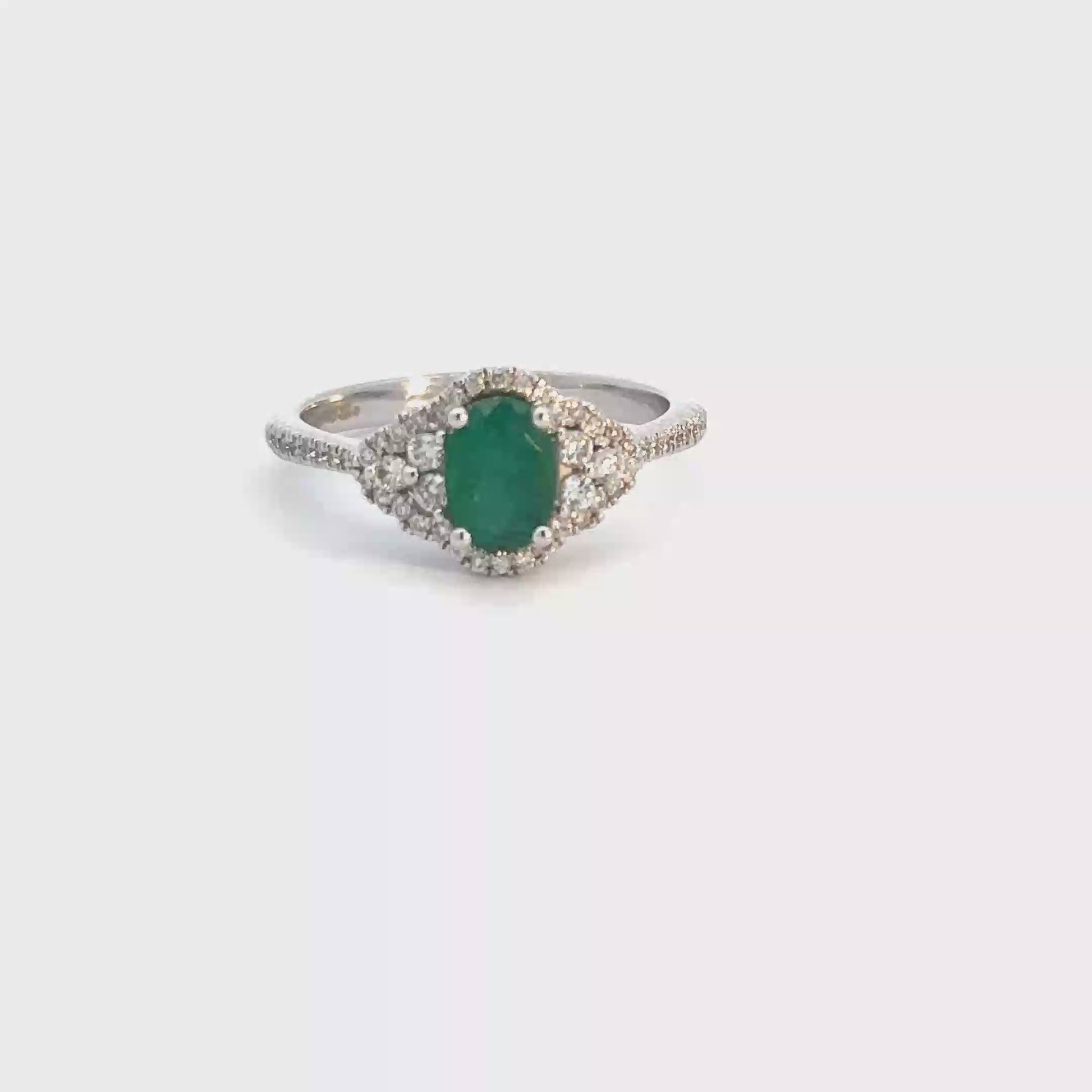 This 14k white gold emerald and diamond ring features an oval 7x5mm emerald and round brilliant diamond accents. The diamonds have an approximate total weight of .25cttw, with a clarity of SI1 and a body color of (F-G).
