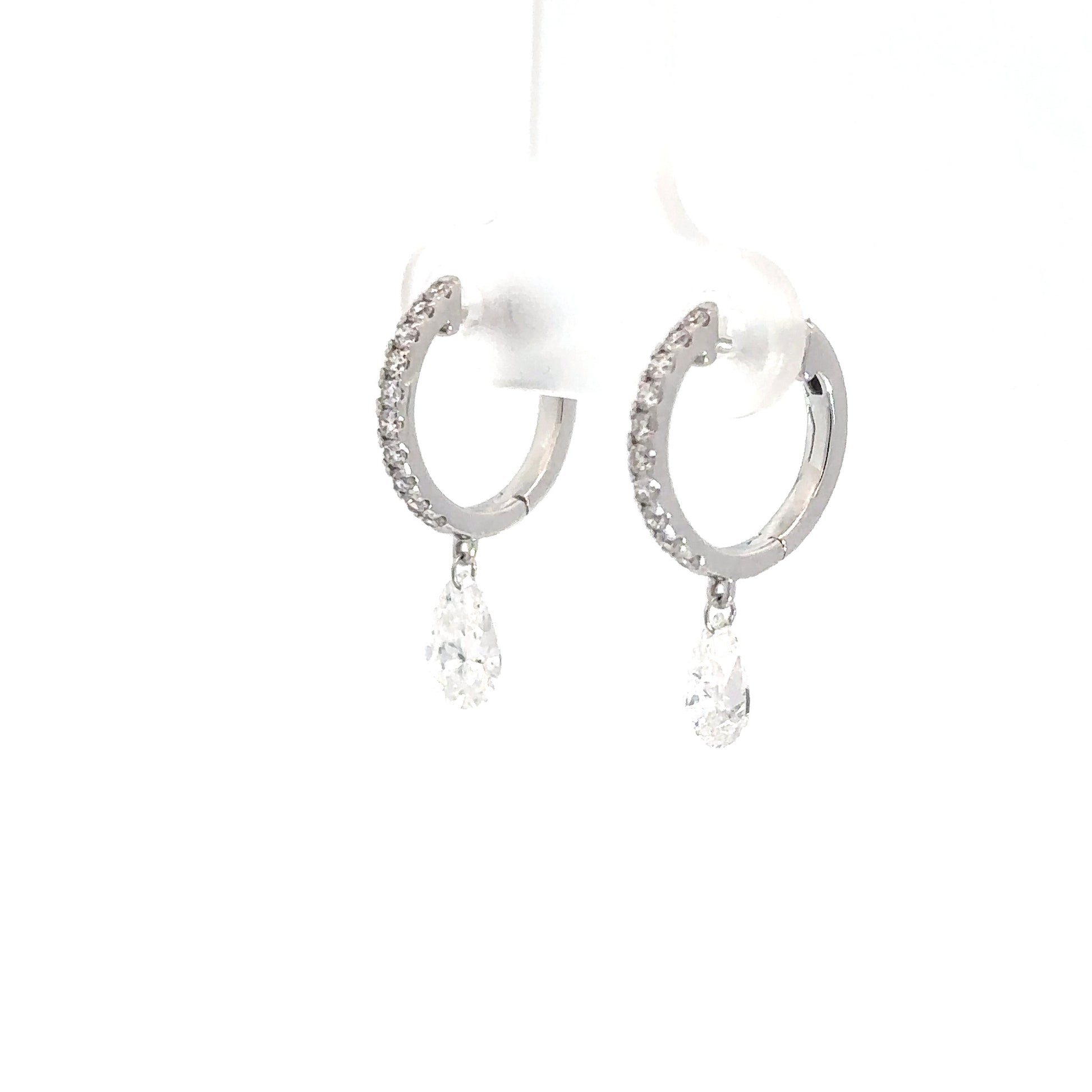 Elevate your everyday elegance with these stunning 14k white gold hoop earrings, featuring lab-grown diamonds that deliver brilliant sparkle without compromise. Round brilliant stones dance along the curved hoop, while a graceful pear-shaped diamond dangles beneath, creating captivating movement with every turn of your head. Totaling approximately 1.25 carats, these lab-grown diamonds offer exceptional quality and ethical sourcing. Perfect for those who appreciate modern sophistication with a touch of glamour, these versatile hoops transition seamlessly from day to night.