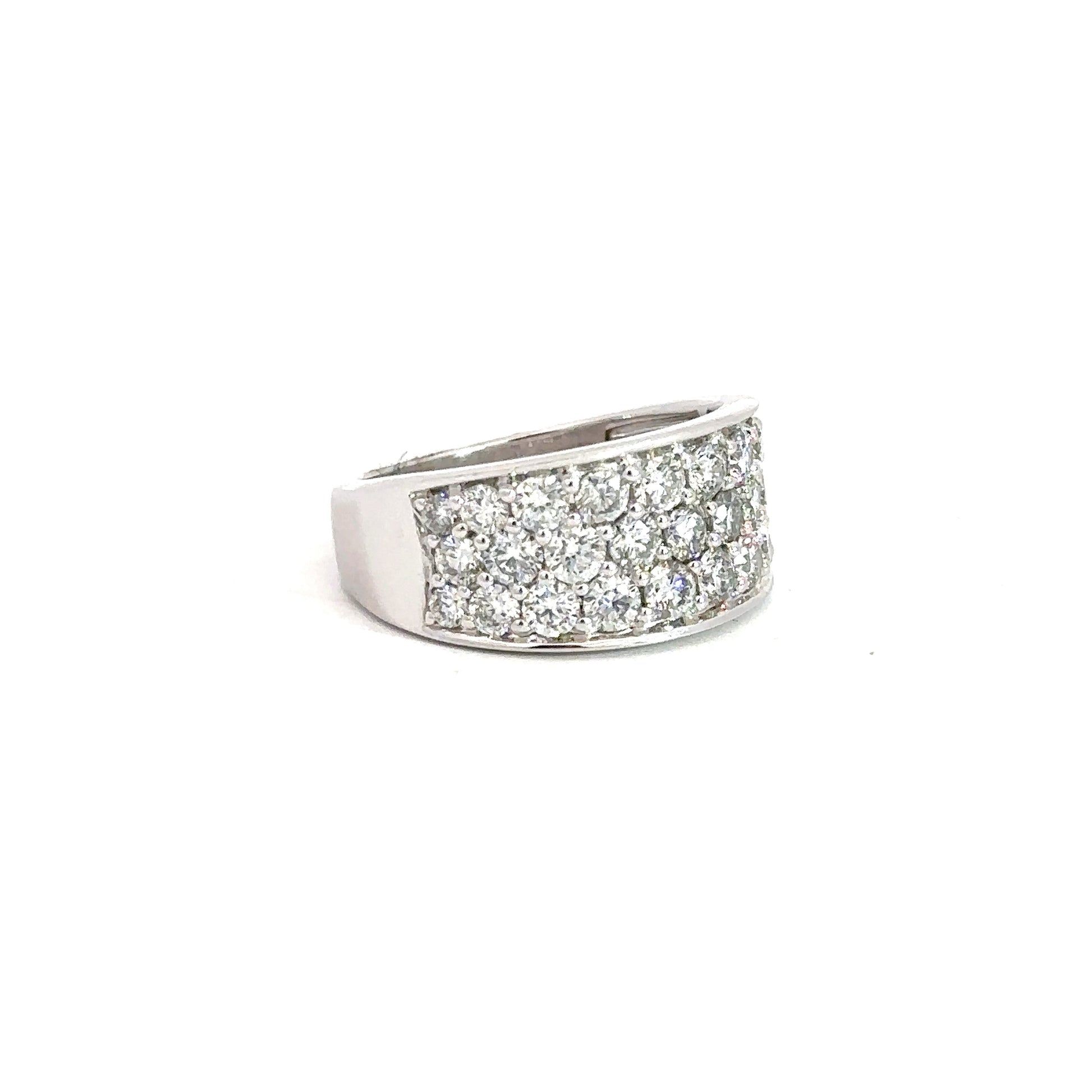 This elegant lady’s ring is crafted from 14k white gold and features numerous round brilliant diamonds set in a pave style. With a combined diamond weight of approximately 2.50 carats, these stones boast VS clarity and an exceptional E-F body color, offering a stunning sparkle and refined sophistication.