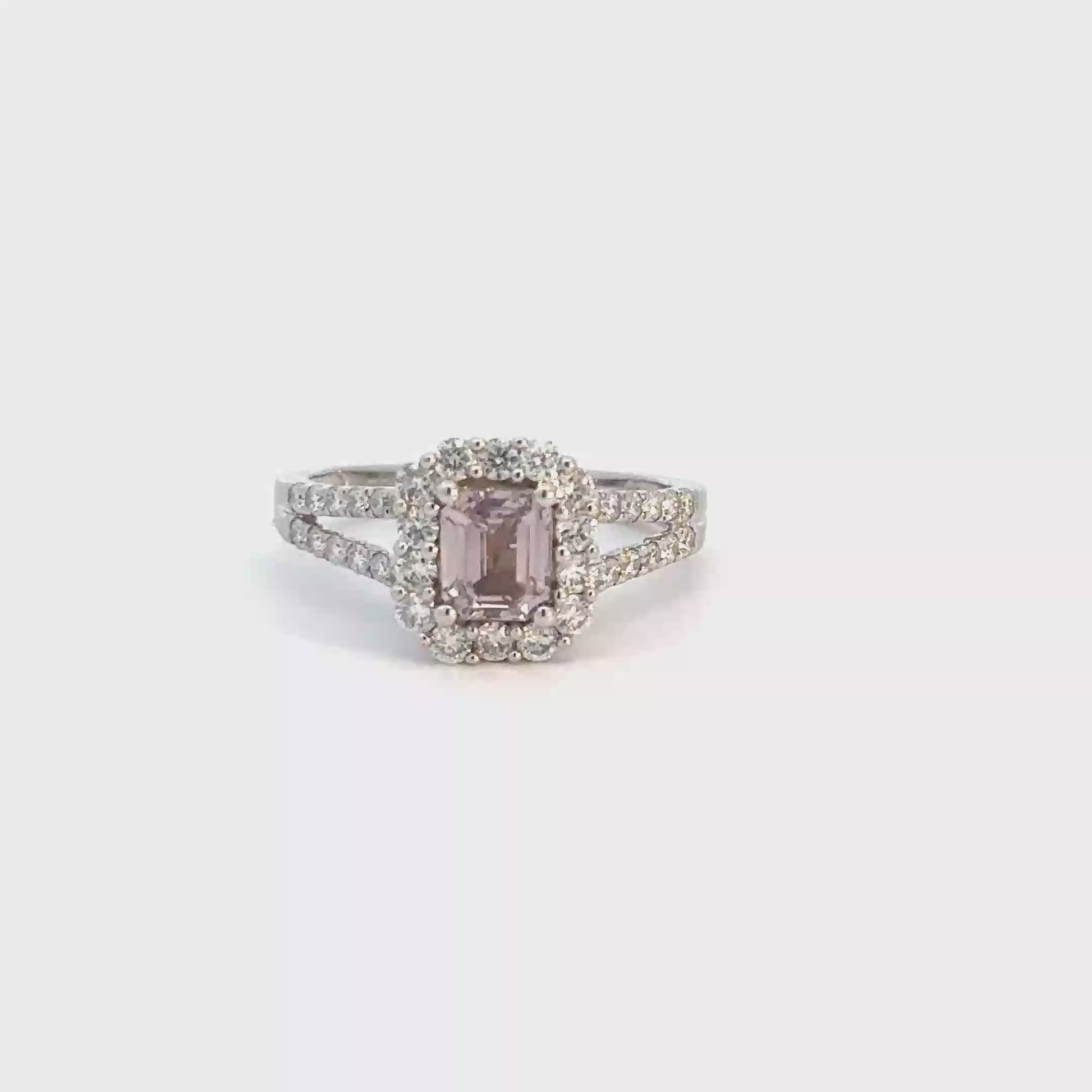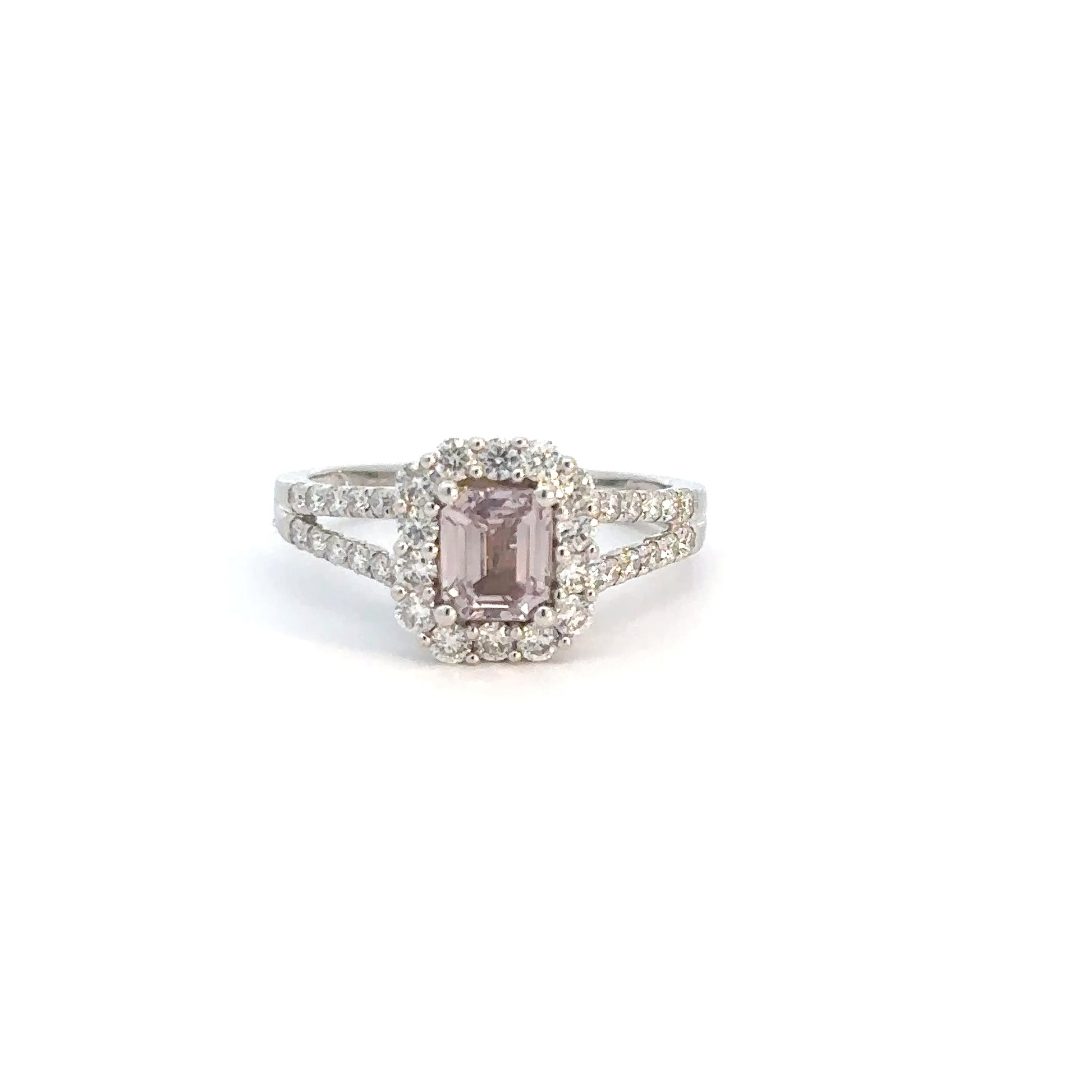 Expertly crafted in 14k white gold, this ring features a dazzling 7x5mm emerald cut pink sapphire surrounded by a diamond halo and split shank. The diamonds, with a total weight of .88cttw, boast a clarity of SI1 and a body color of (F-G).