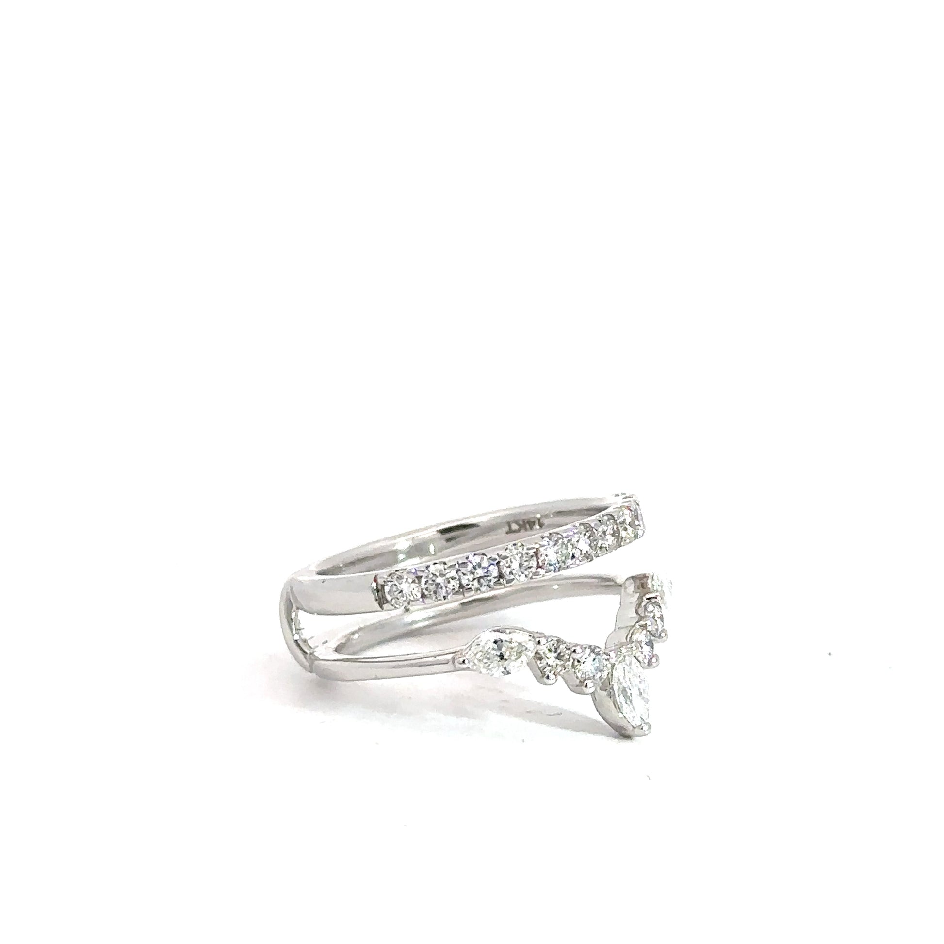 Elevate your look with this elegant 14k white gold ring jacket designed for ladies. Featuring a stunning row of round brilliant diamonds, accented by a V-shaped arrangement of marquise and round brilliant diamonds, it offers a total diamond weight of approximately .92cttw. This sophisticated piece enhances any ring with a graceful sparkle and distinctive design.