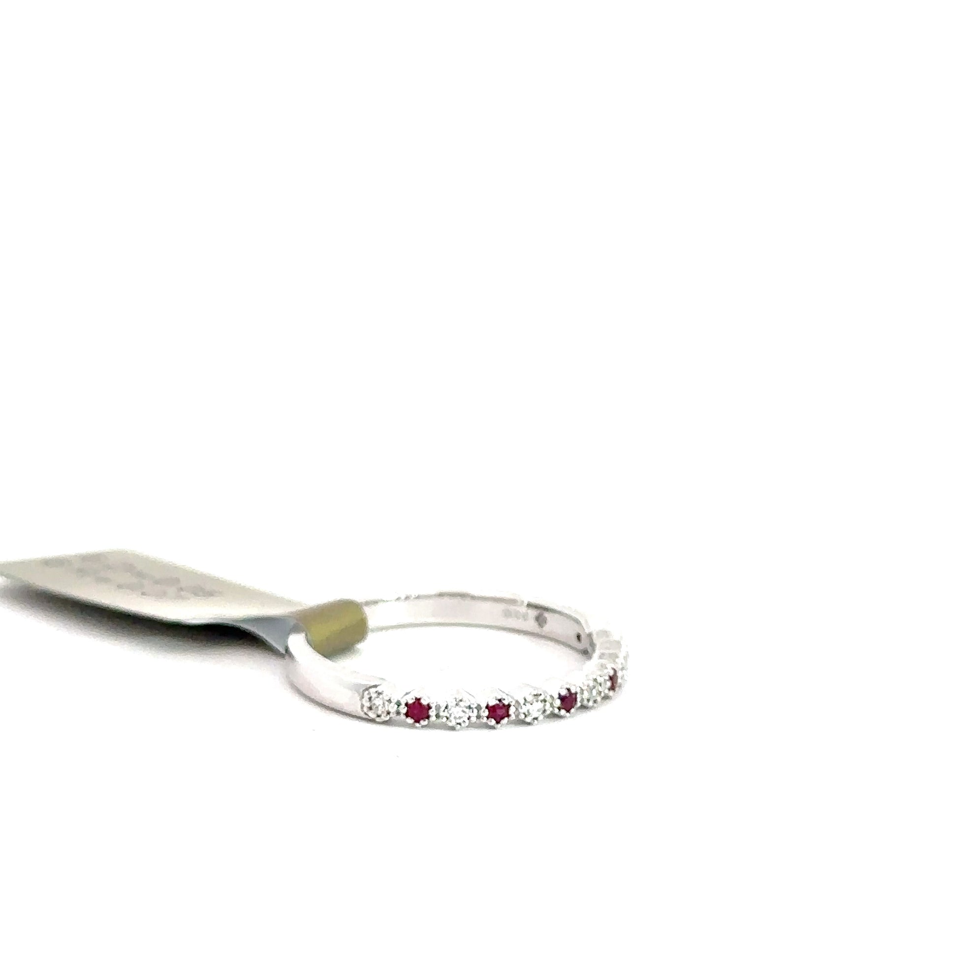Elevate your elegance with this stunning 14k white gold ring, where deep red rubies and sparkling diamonds create a captivating alternating pattern. Featuring six brilliant diamonds totaling approximately .05 carats and six vibrant rubies, this piece combines timeless sophistication with striking color contrast. Perfect for those who appreciate refined luxury and distinctive design, this ring makes a memorable statement for any occasion.