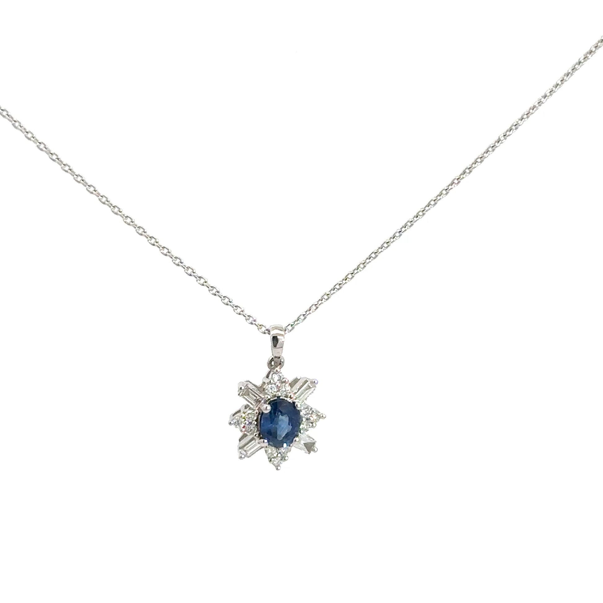 This 14k white gold pendant features a unique diamond halo surrounding a 5x4mm oval sapphire. The accent diamonds include round brilliant and baguette cuts, with a combined weight of approximately .25cttw.