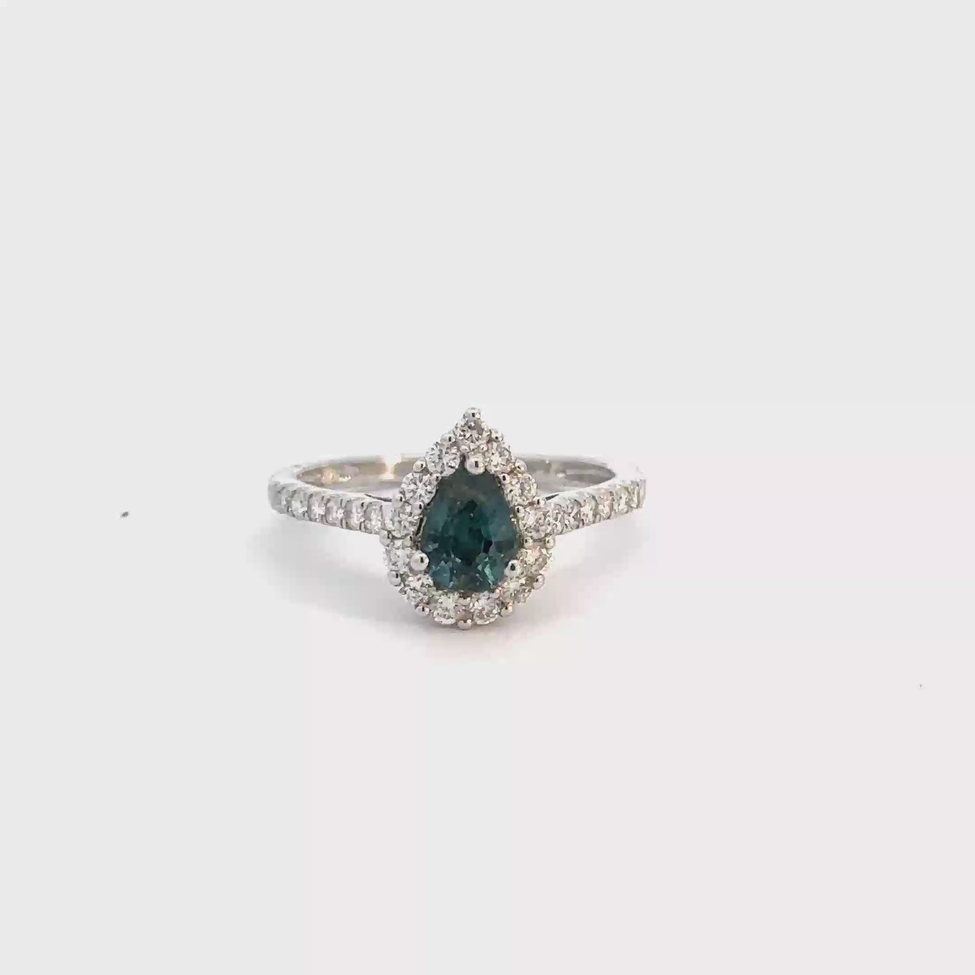 Crafted from 14k white gold, this elegant ring showcases a dazzling pear-shaped 8x6mm sapphire at its center. Sparkling diamonds line the sides and encircle the sapphire, with a total weight of approximately .62cttw. These diamonds boast a Si1 clarity and a (G-H) body color.