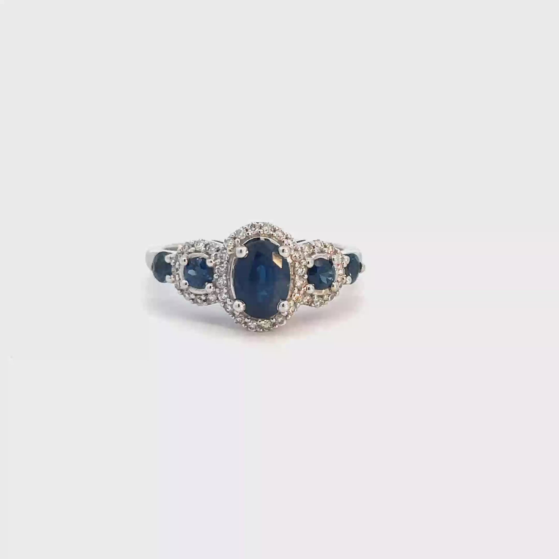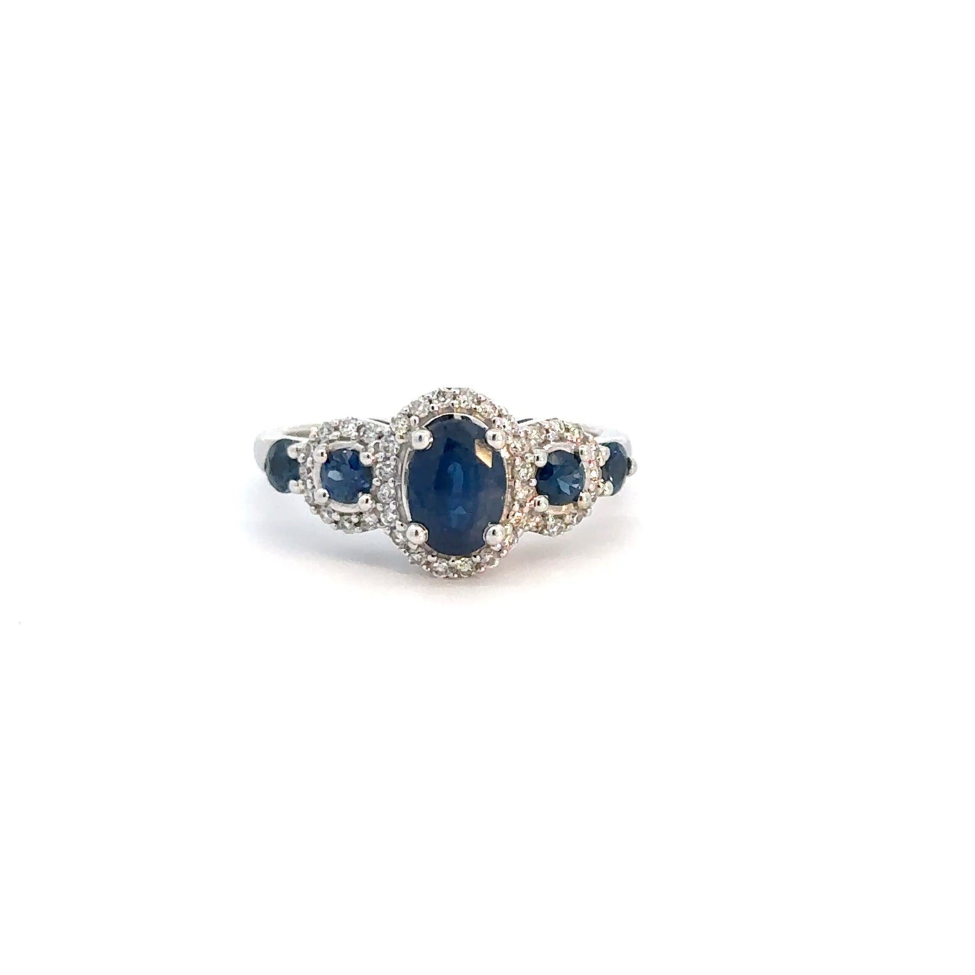 Expertly crafted from 14k white gold, this elegant ring showcases a stunning 7x5mm oval sapphire at its center, encircled by a halo of sparkling diamonds. Four additional round sapphires sit on each side, also surrounded by shimmering halos. The total weight of these diamonds is an approximate .25cttw.