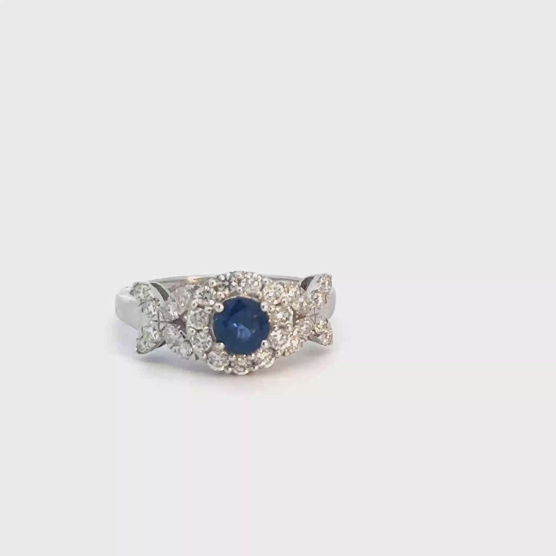 This 14k white gold sapphire and diamond ring features a round sapphire center, surrounded by a halo of diamonds and adorned with diamond x on each side. The diamonds have a total weight of approximately .75cttw, with a clarity grade of VS-SI and a body color of (E-F).