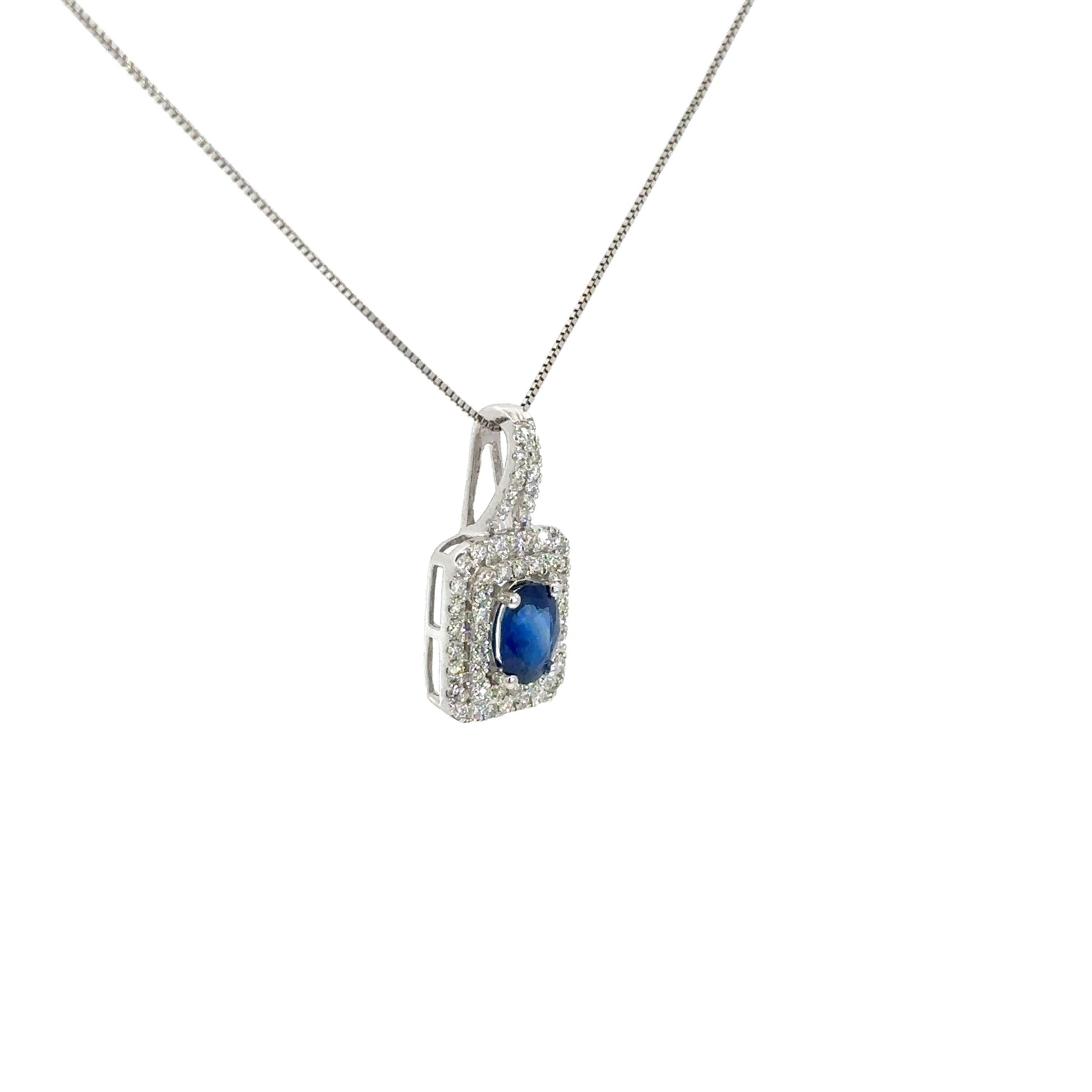 This elegant pendant features an oval sapphire embraced by a double halo of sparkling diamonds, all set in 14k white gold. The diamond-accented bail adds exquisite detail, with the diamonds totaling approximately .50 carats. A timeless piece designed to captivate and enhance any jewelry collection.
