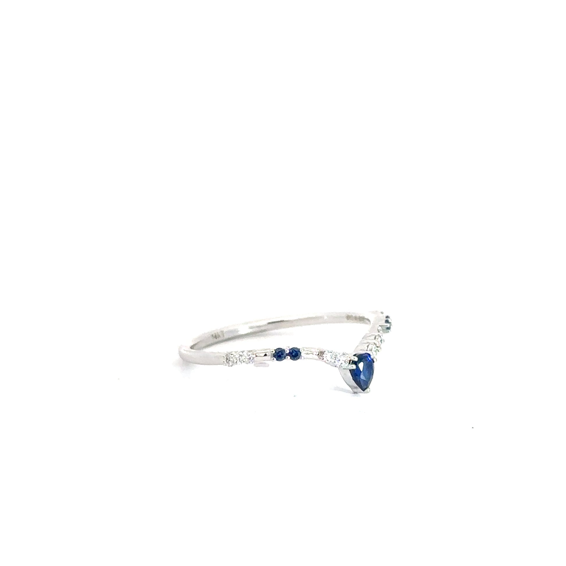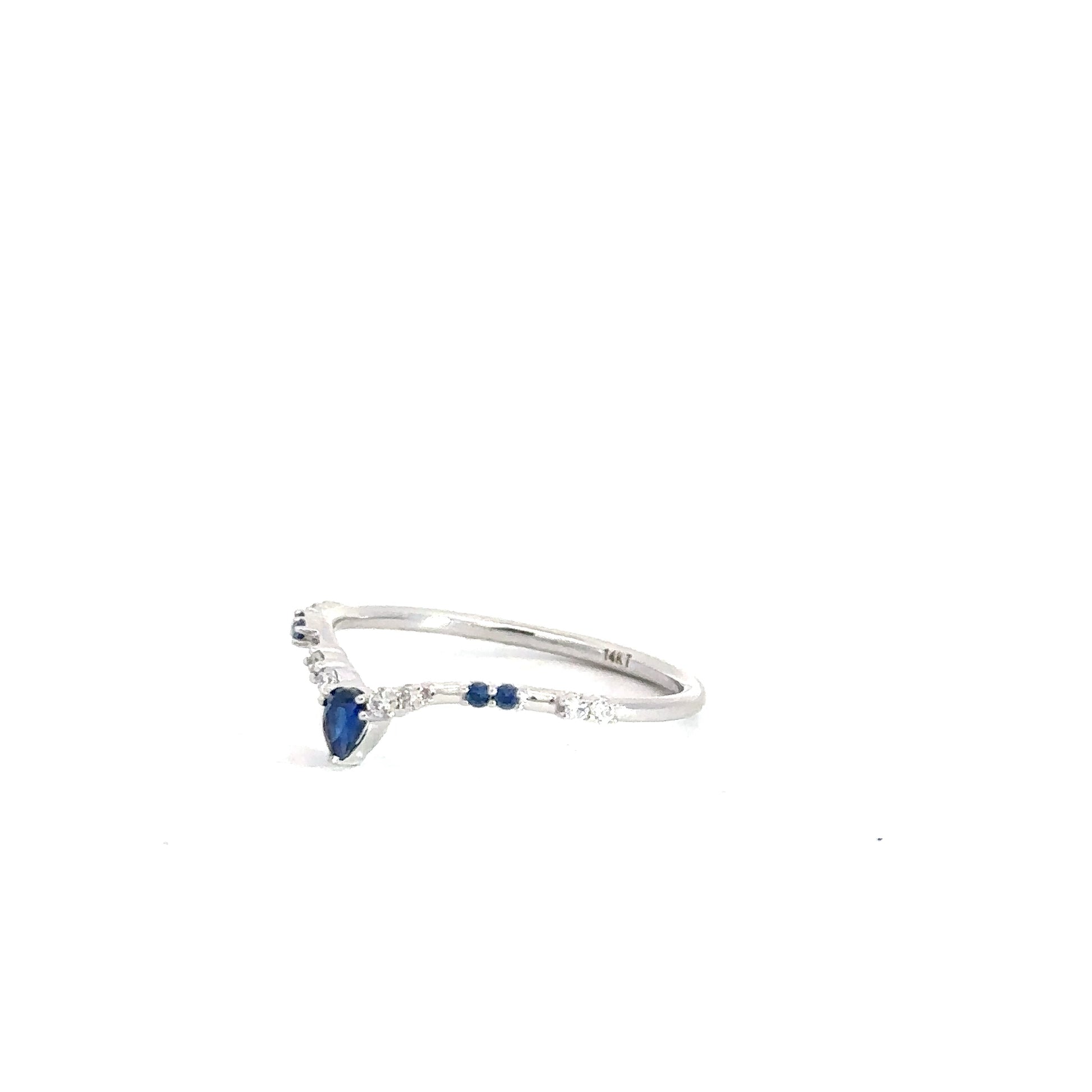This elegant 14k white gold contour band features lab-grown diamonds and sapphires arranged beautifully. At the center is a pear-shaped sapphire, flanked by two round brilliant lab-grown diamonds, followed by pairs of sapphires and additional round brilliant lab diamonds. The diamonds collectively weigh approximately 0.07 carats, adding a subtle sparkle to this stunning piece.
