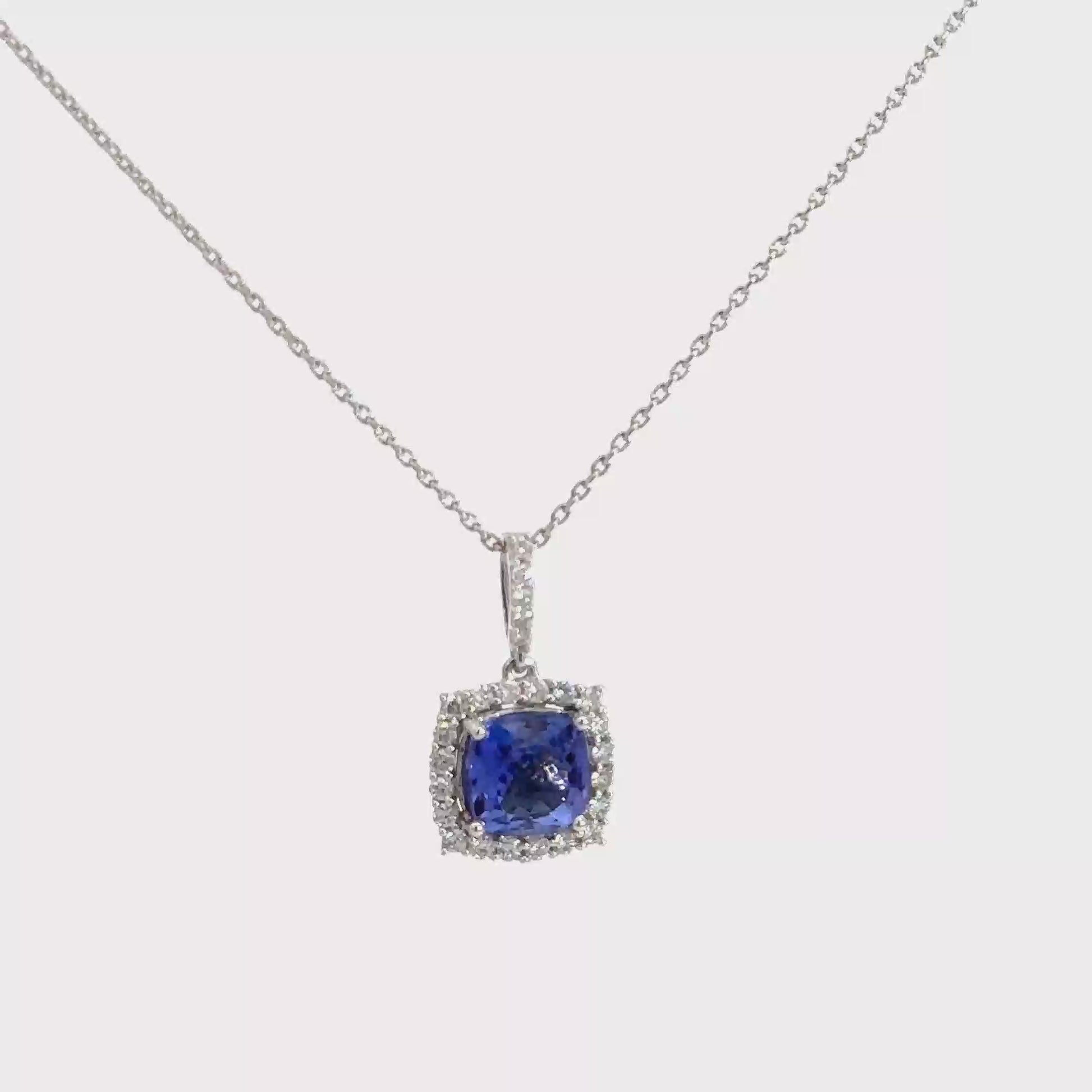 The cushion cut tanzanite in this 14k white gold pendant is beautifully adorned by a halo of round brilliant diamonds. Boasting an approximate total weight of .25cttw, these diamonds have a clarity of SI1 and a body color of (G-H).