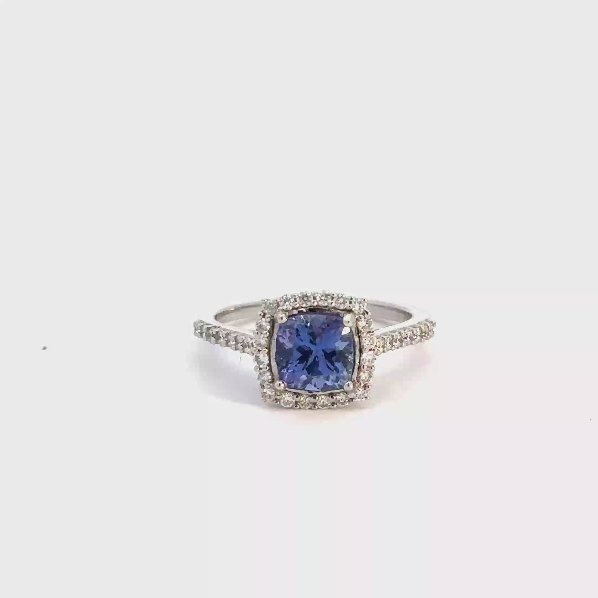 Enhance your jewelry collection with this exquisite 14k white gold tanzanite and diamond ring. Featuring a beautiful cushion cut tanzanite center, this ring is adorned with round brilliant diamonds on the sides and around the center. The diamonds, with a clarity of SI and a body color of (G-H), have an approximate total weight of 3/8cttw.