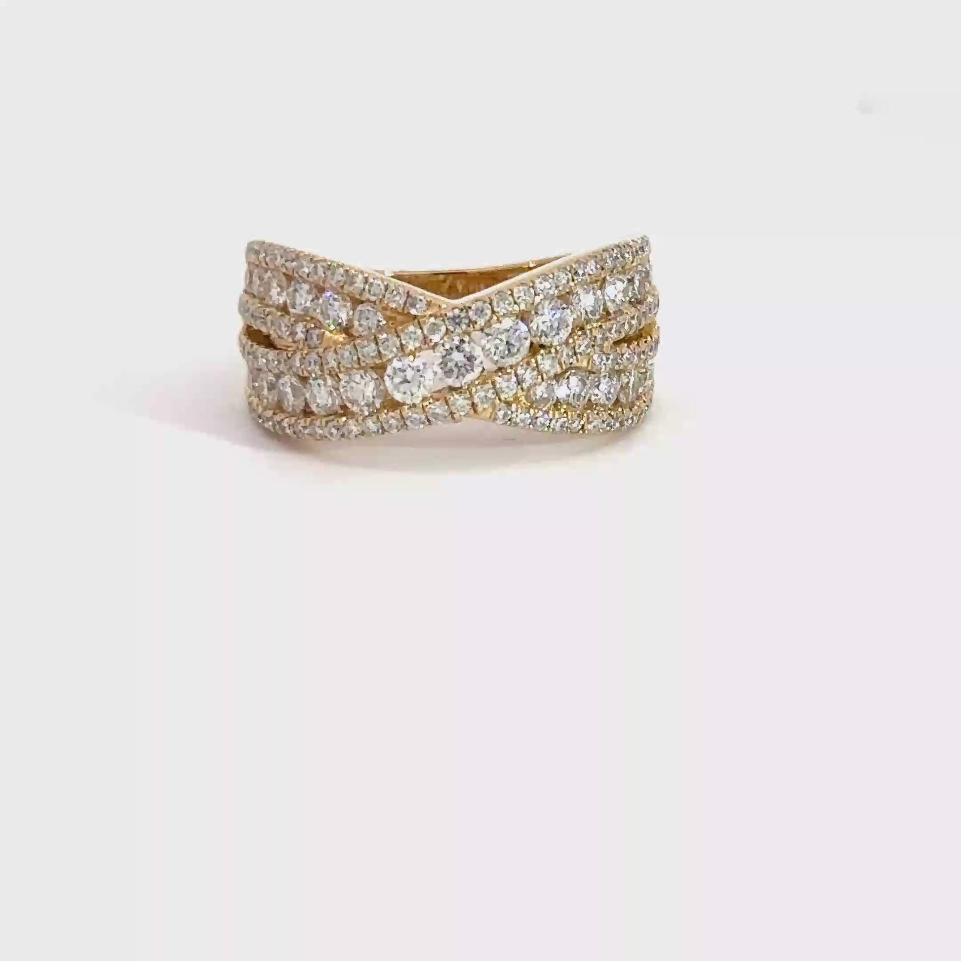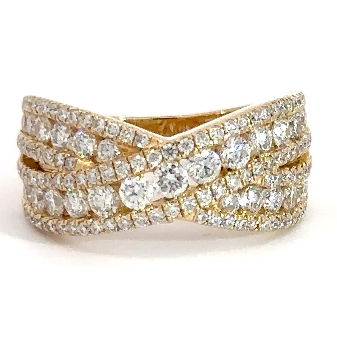 This 14k yellow gold fashion ring features round brilliant diamonds of different sizes arranged in a criss-cross pattern at its center. The diamonds have a combined weight of approximately 1.75cttw and exhibit a clarity of VS2 and a body color in the range of F-G.