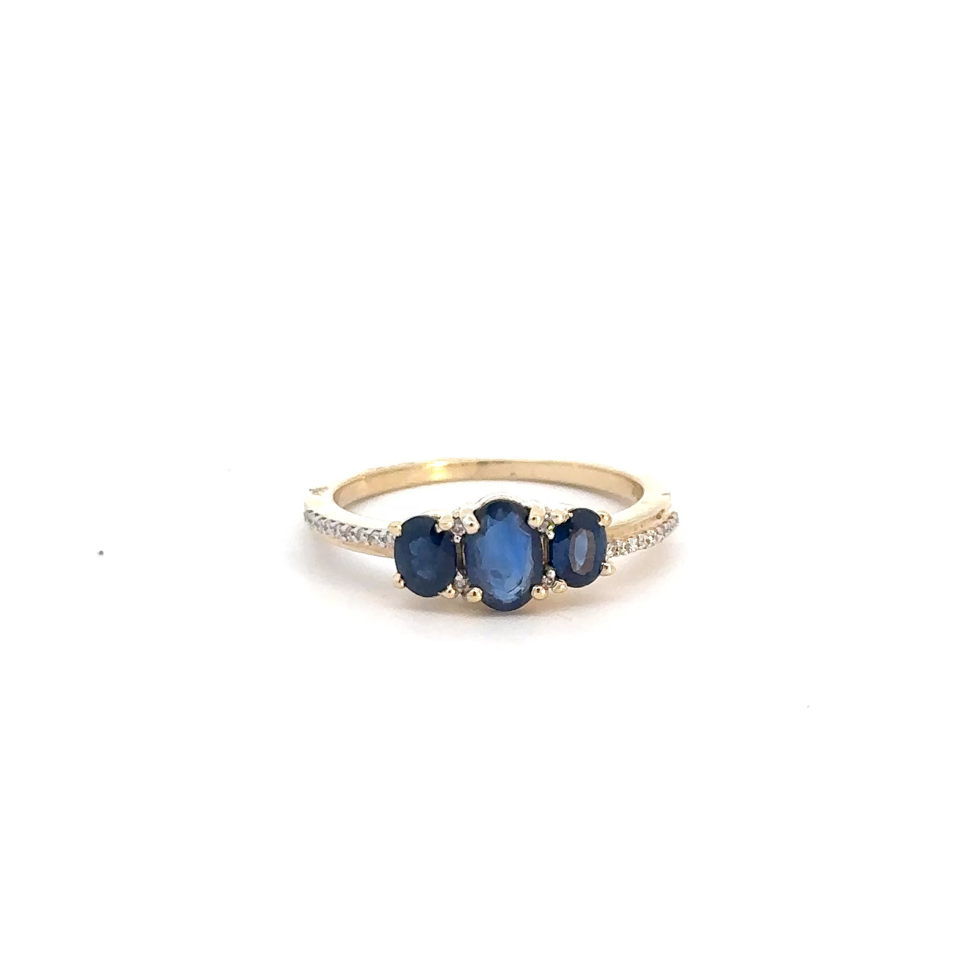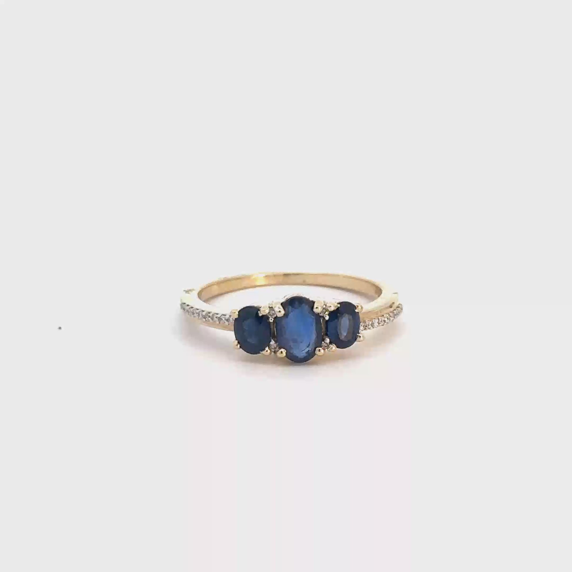 This exquisite ring is crafted from 14k yellow gold and features 3 stunning oval sapphires at its center, accented by shimmering round brilliant diamonds along the sides.