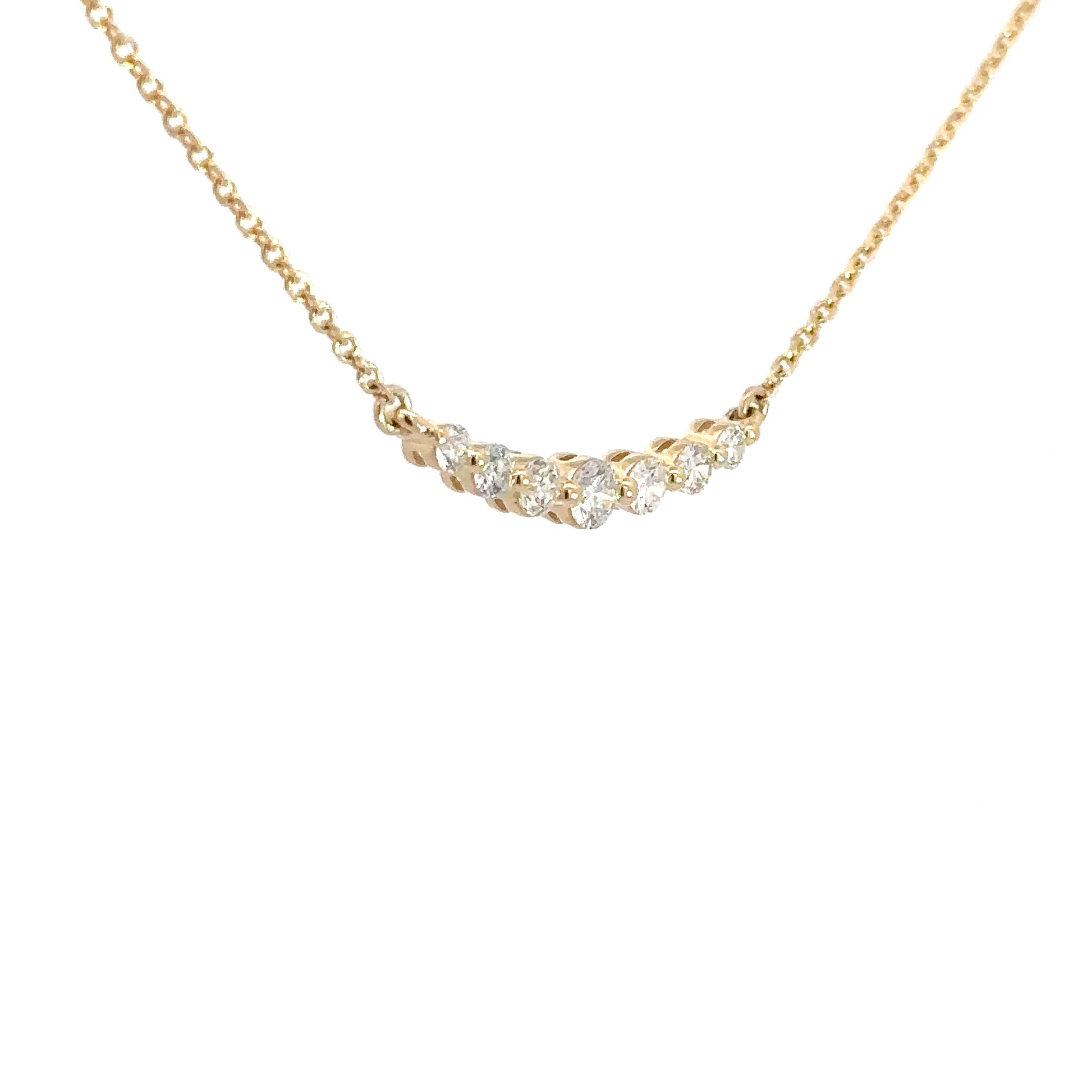 Elevate your everyday elegance with this stunning 14k yellow gold necklace, featuring seven sparkling round brilliant diamonds totaling .90 carats. The thoughtfully arranged diamonds in graduated sizes create a sophisticated bar design that catches light beautifully from every angle. Perfect for layering or wearing solo, this timeless piece combines classic luxury with versatile style, making it an investment in jewelry you'll treasure for years to come.