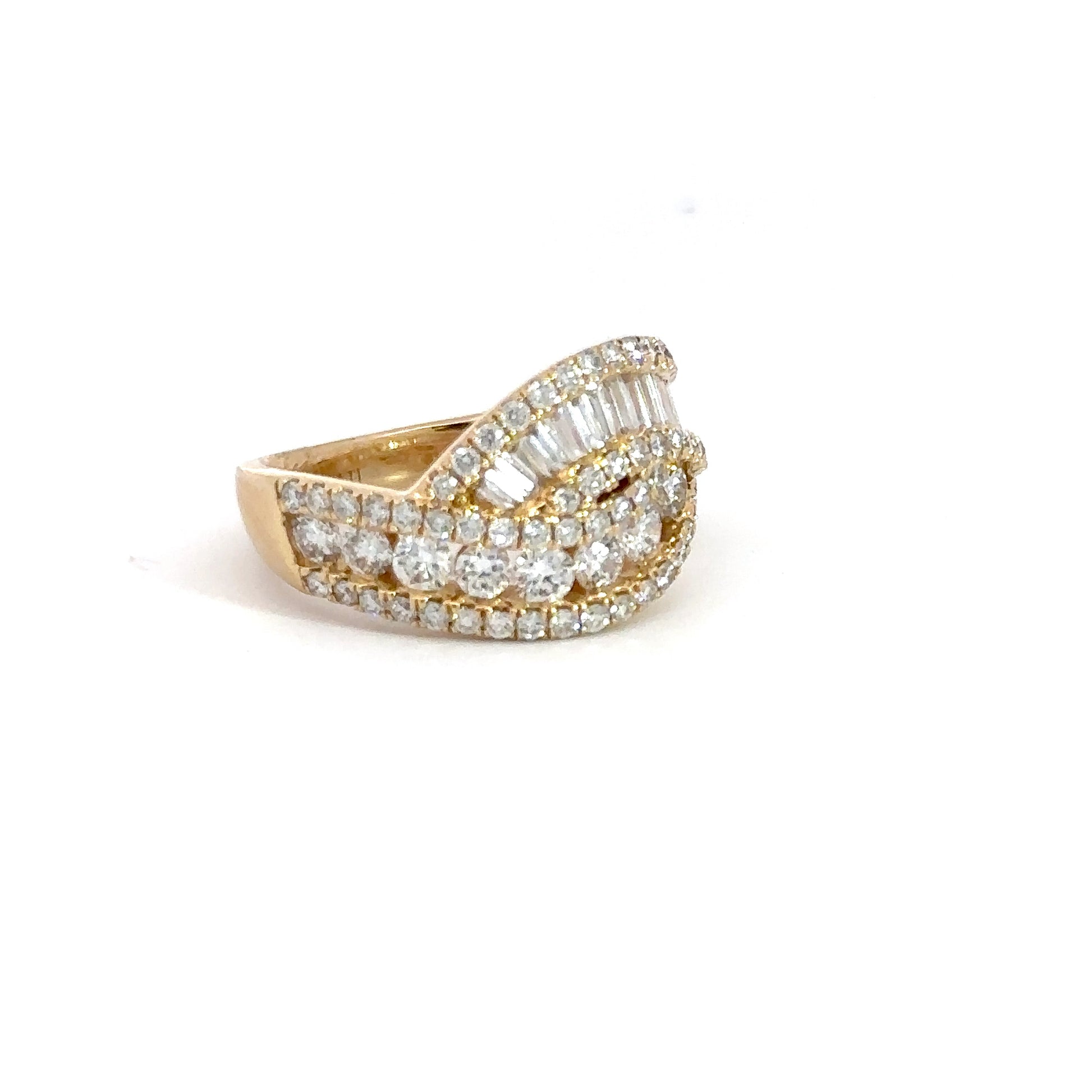 Crafted from 14k yellow gold, this elegant fashion ring showcases a stunning swirl pattern composed of round brilliant and baguette diamonds. With an approximate total weight of 2cttw, the diamonds boast a clarity range of VS-SI and a vivid body color of (E-F).